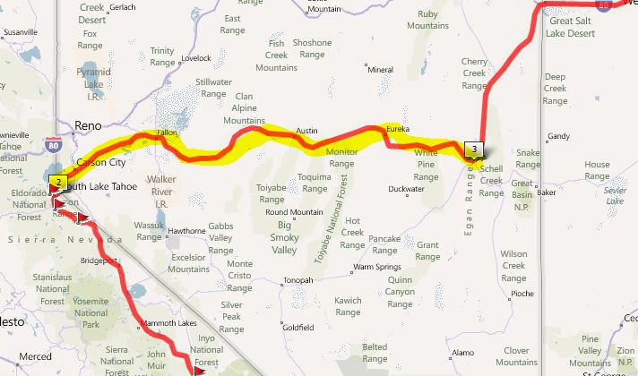 De South Lake Tahoe, CA à Ely, NV, 361 miles.