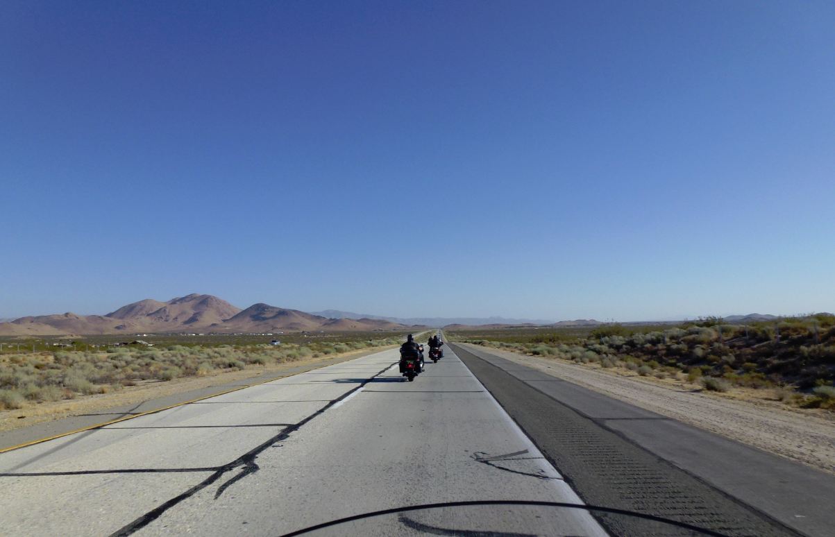 A 80 mph, nous perçons ces immenses plaines sèches entrecoupées de chaînes montagneuses. L’air est épais de chaleur. Les moteurs ronrugissent de bonheur et nous fonçons, écarquillés, jusqu’à plus soif. Les cols sont avalés facilement.