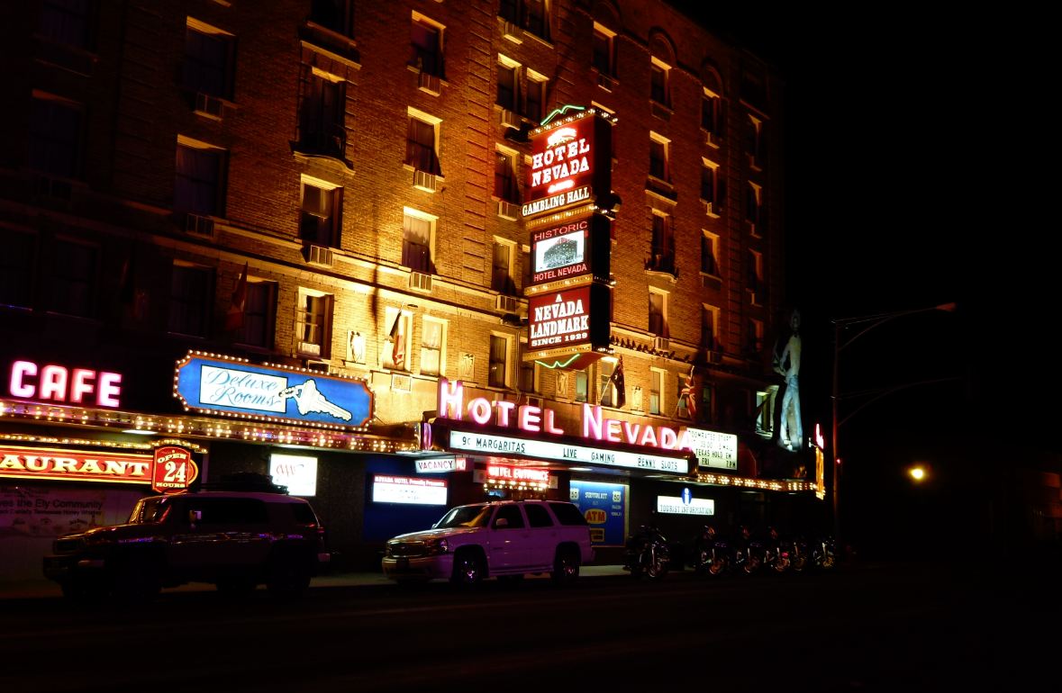 Nous traversons lentement la ville à la recherche d’un motel. Trouver une chambre se révèle plus ardu que nous l’imaginions. Finalement, nous en dégottons trois in extremis au Nevada Hotel, bâtisse historique qui, avec ses cinq étages, fut un temps l’immeuble le plus élevé du Nevada ! Les chambres nous coûtent USD 44.- chacune. Dick, Jim et Fred se casent dans une, alors que Dom et Phil bénéficient de chambres individuelles. Après une pareille étape, nous sommes bien content d’avoir un lit propre !