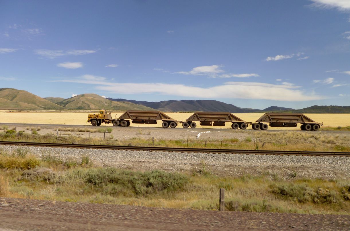 Ensuite, c’est la descente dans un paysage qui s’ouvre progressivement, fait de prairies et de bois de pins moutonnant paresseusement. Nous entrons dans un pays de ranches. A l’horizon, les sommets plus escarpés et parfois encore un peu enneigés des Wasatch Ranges. Finalement nous atteignons la plaine de la Bear River. Nous faisons le plein à Woodruff, dans une station-service tenue par une charmante jeune femme dont le T-shirt proclame fièrement « Testicle Festival » ! Au secours ! Elle m’explique qu’il s’agit d’une fête locale durant laquelle on se nourrit exclusivement de testicules, mais heureusement pas ceux des étrangers de passage !