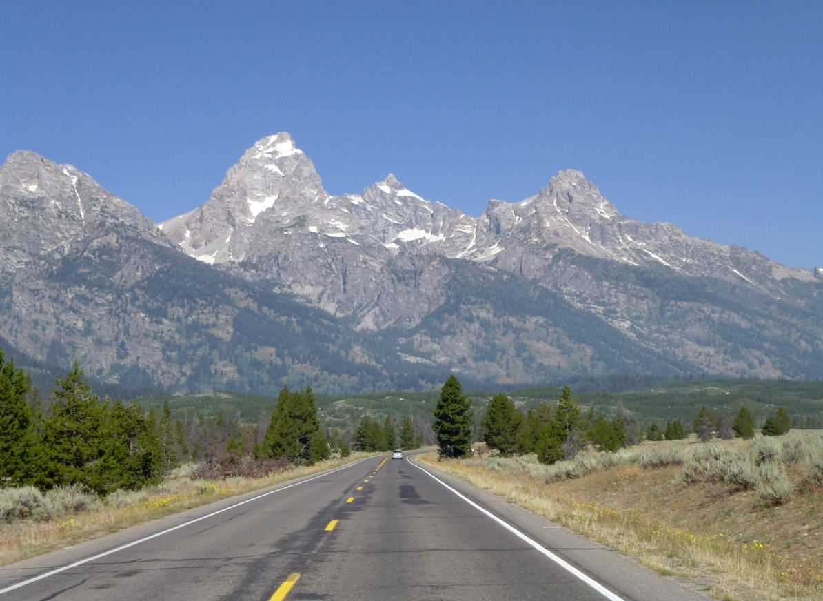 A la vitesse limitée de 45 mph, nous faisons une boucle sur la 10 pour se rapprocher des pics de Grand Teton qui se découpent nettement dans un ciel bleu de fin de matinée. Pointes de roche beige zébrée de neige qui s’élèvent jusqu'à 4'200 mètres, contreforts couverts de pins, air vif et soleil commençant à nous réchauffer s’allient pour chasser les miasmes de la courte nuit.