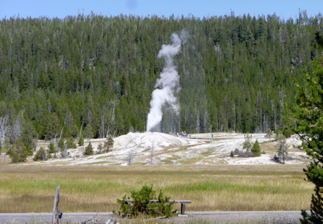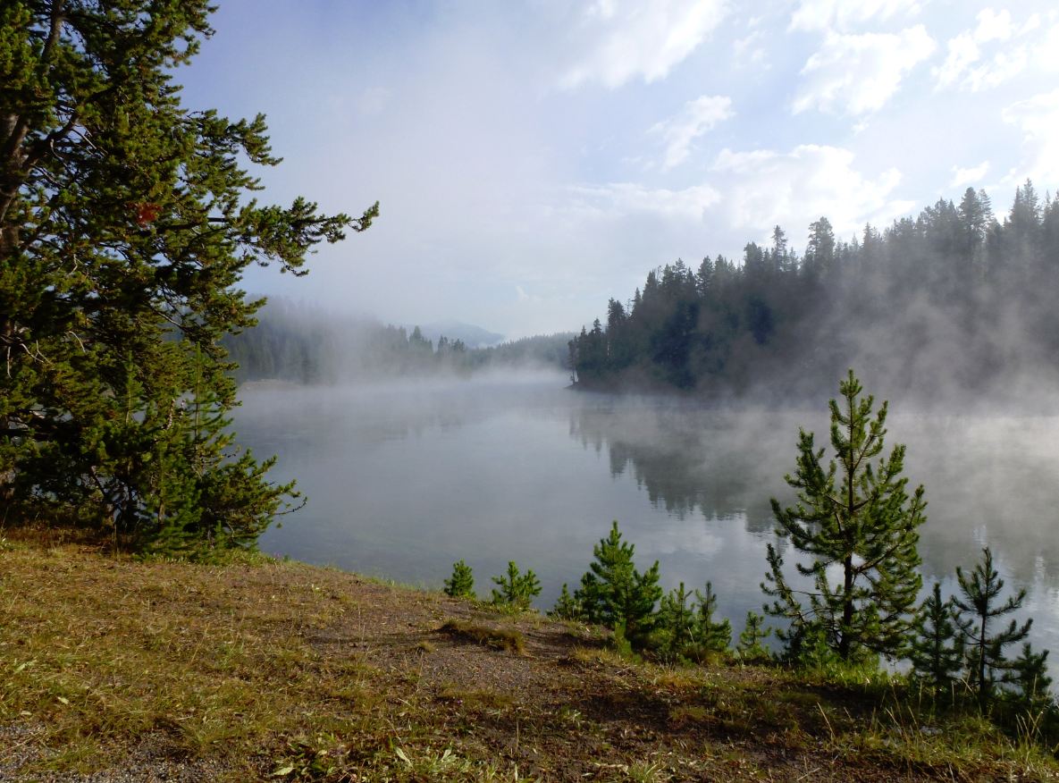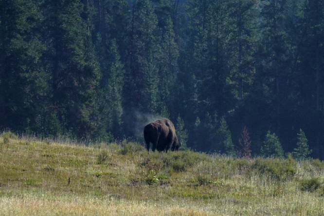 Nous entrons peu après dans le Yellowstone par la South Entrance. Dick aperçoit une biche alors que Dom et Fred s’arrêtent pour photographier leur premier bison qui paresse dans les hautes herbes. L’altitude est de 2'500 m alors que nous longeons Lewis Lake.