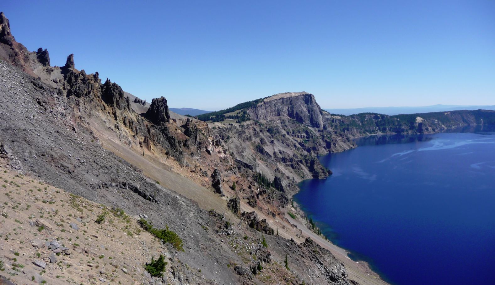 De Chiloquin c’est la 62 qui nous fait rejoindre le pied des montagnes dans lesquelles se niche Crater Lake. Nous grimpons une belle route toute en lacets et épingles à cheveux, ce qui occasionne quelques dépassements limites. Mais la vue à l’arrivée en vaut la peine. Ce lac circulaire est d’une beauté à couper le souffle. Son bleu profond est incroyable. Au milieu se dresse l’île Wizard. Ce lac, à plus de 200 mètres d’altitude, faisant 600 m de profondeur est en fait une caldera provenant de l’explosion d’un volcan il y a 500'000 ans. Il s’est progressivement rempli d’eau de pluie et de neige. Il tombe encore une quinzaine de mètres de neige par an. D’ailleurs, on en voit encore un peu en plein mois d’août.
