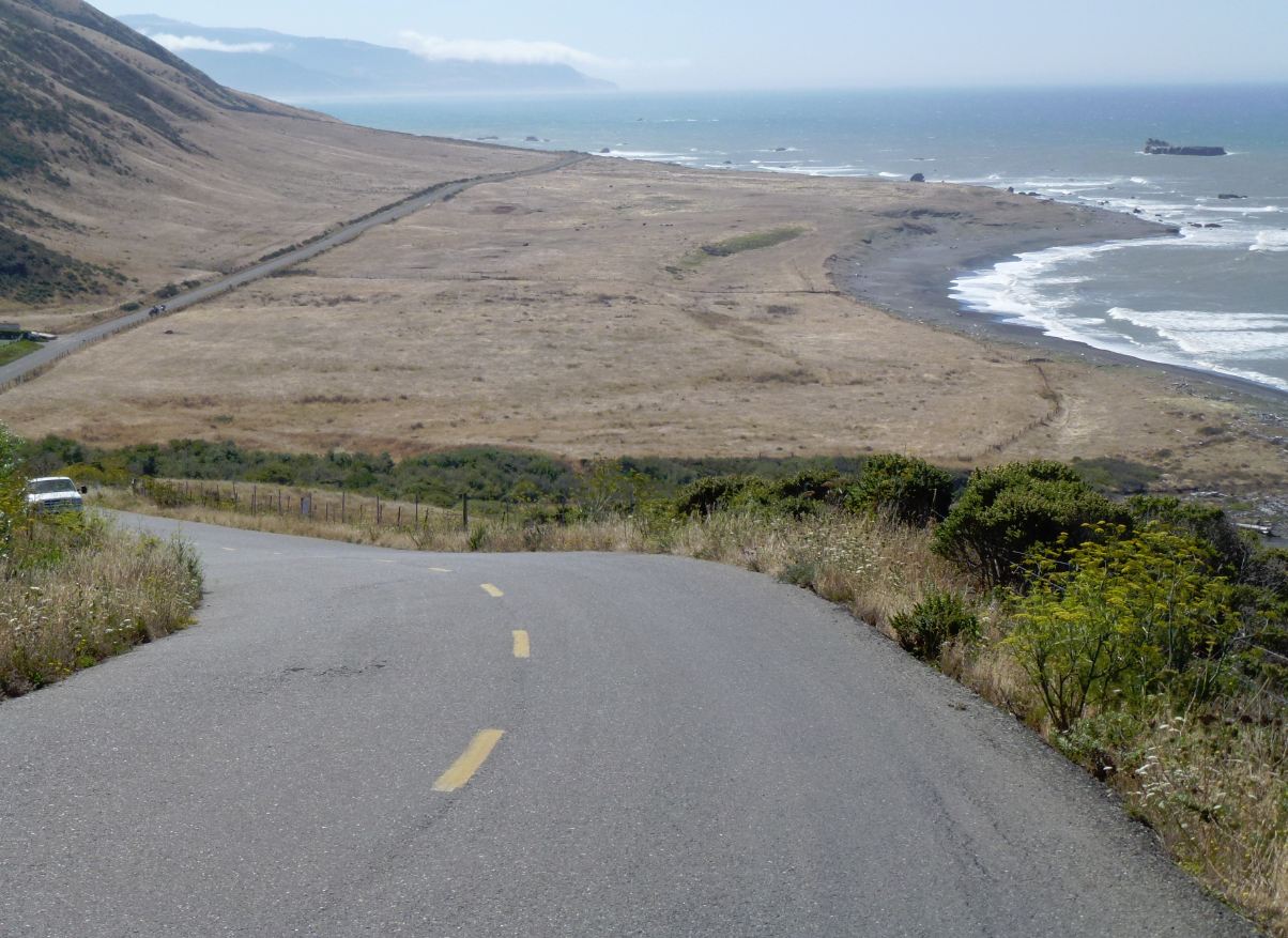Nous prenons assez rapidement à droite à Loleta en direction de the Lost Coast, dans une variante du plan initial de Phil concoctée par Fred. Sitôt passé Ferndale, jolie bourgade de caractère, la route se dégrade sérieusement en grimpant dans une région de collines boisées. Des nids de poule énormes sont sournoisement tapis dans les flaques d‘ombre et l’on craint à chaque instant de se rompre le dos en même temps que la suspension. Celle qui chute immédiatement, c’est la moyenne horaire car la route se transforme sur certains tronçons en piste africaine. Les hommes et les bêtes souffrent et il devient assez vite évident qu’espérer déjeuner à Mendocino, une cinquantaine de miles plus au sud, est illusoire.