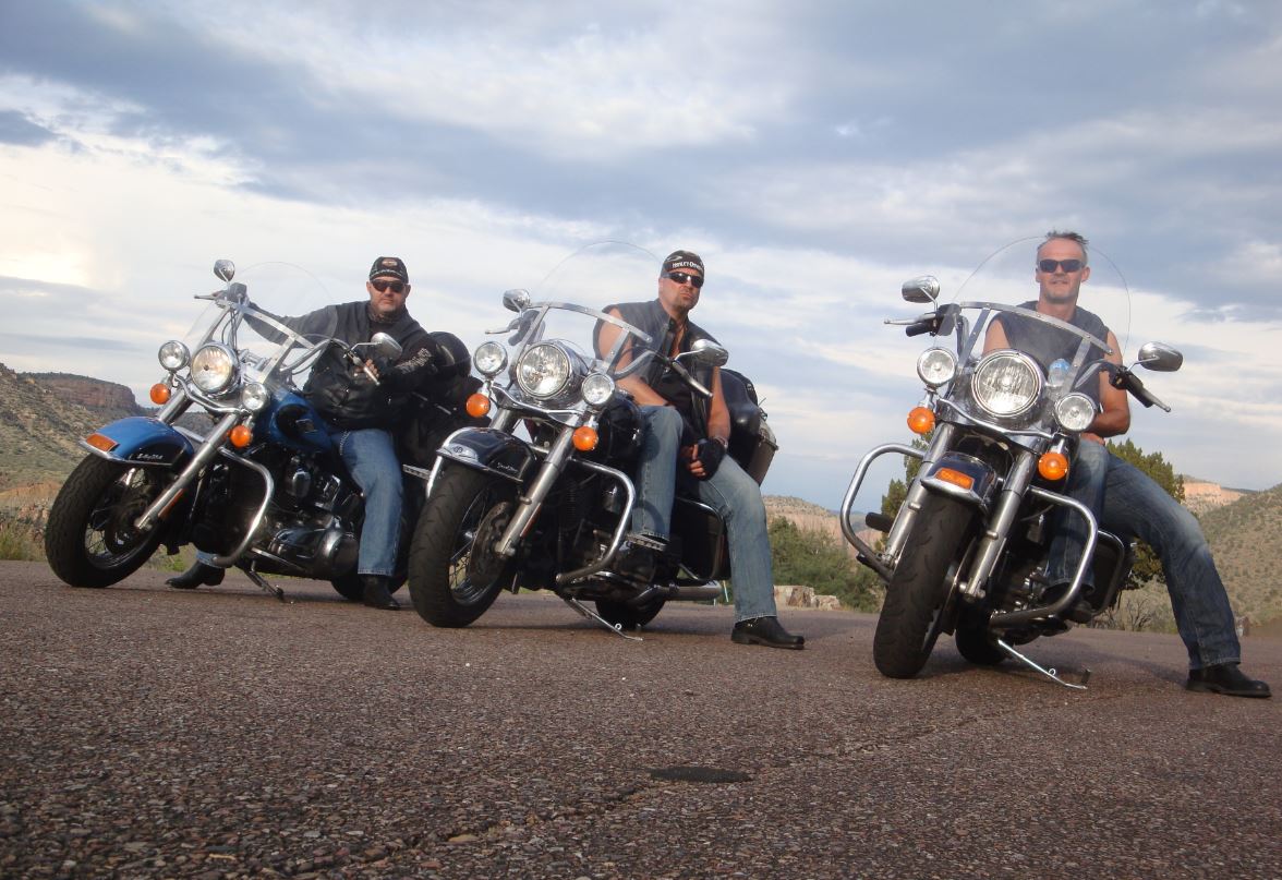 Dans l'ordre ci-dessus, Pat sur une Heritage, PX sur une road King et Dom sur une Road King Classic avec coffre.