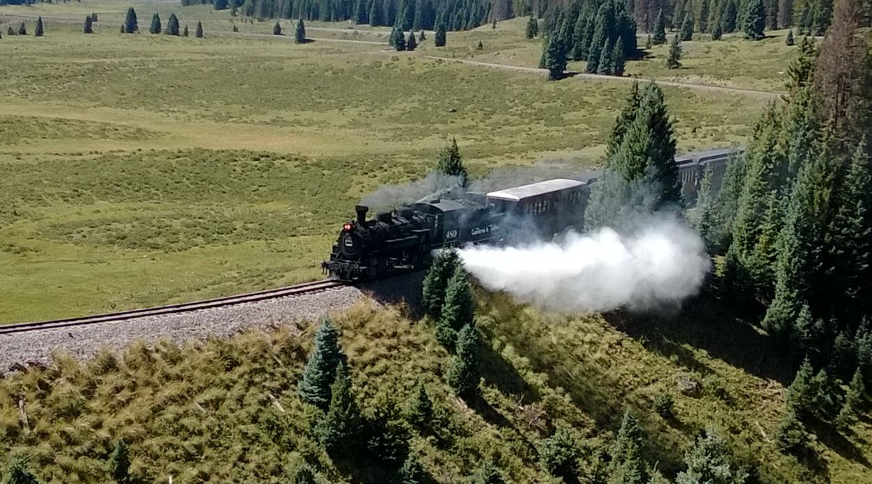 Après une dernière courbe avant de passer le col, à notre grande surprise, sommes stoppés nets dans notre élan par un passage à niveau laissant passer un véritable et authentique train à vapeur, faisant la joie de quelques touristes profitant de cette belle journée pour faire une ballade d'une autre époque. Nous laissons passer le convoi quasi imaginaire et reprenons la route avec l'espoir de pouvoir faire quelques photos de ce paysage du Colorado avec en fond de toile le fameux train... et nous y parvenons après quelques miles.