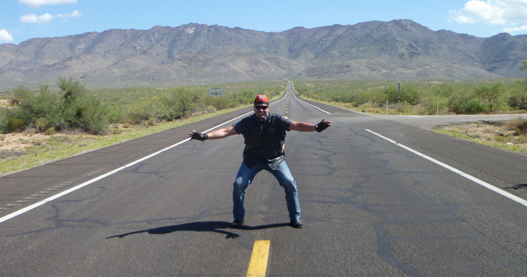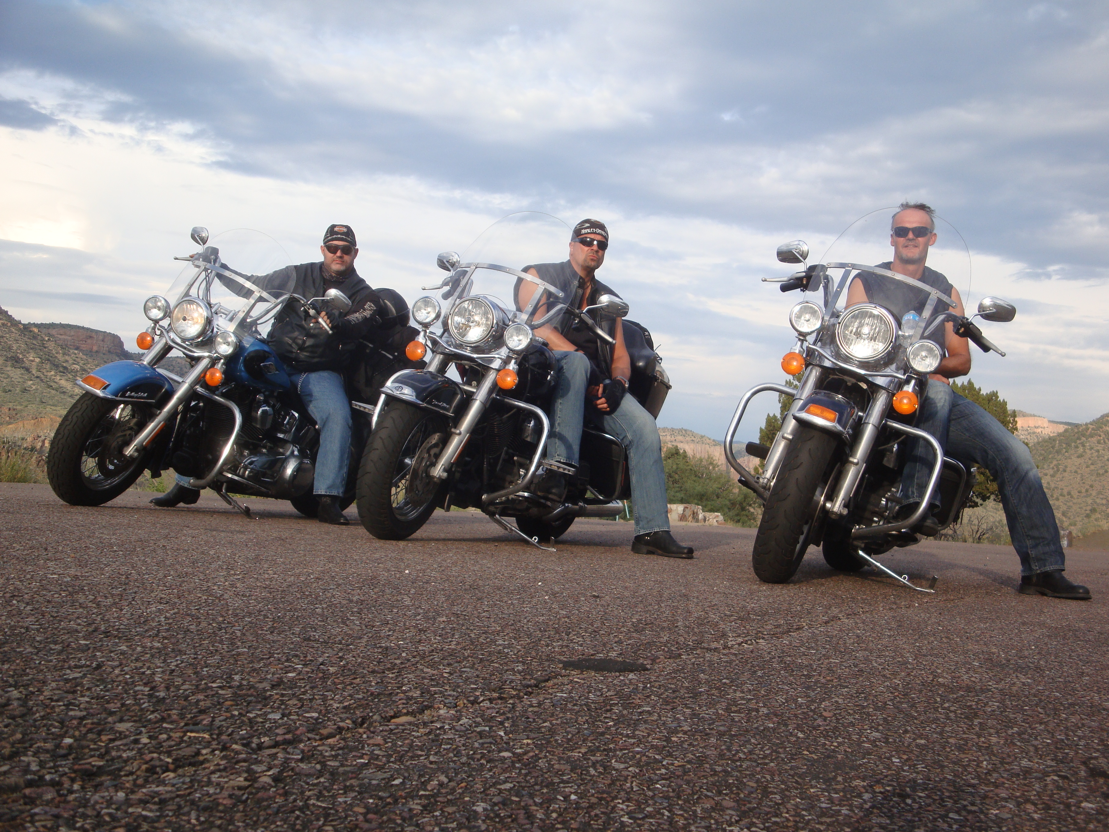 Rejoignons ensuite la 77 et la 60 alors que PX disparait tout à coup du rétro de Dom qui se fait du soucis.. fausse alerte, PX égare son bandana dans la descente et fait demi-tour pour remettre la main sur le bout de tissu retrouvé sur le côté de la route quelques centaines de mètres plus haut et la route continue pour finalement atterrir à Globe, ville minière sans grand intérêt mais dans un Hôtel très agréable. A noter que dans la descente par la 60 sur Globe, nous prenons une route de montagne absolument splendide, sinueuse et dans un cadre "canyon" de toute beauté. Profitons de faire LA PHOTO du ride sur le bas côté de la route suite à une inspiration artistique de Pat.