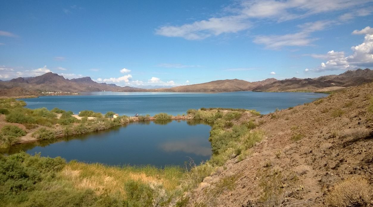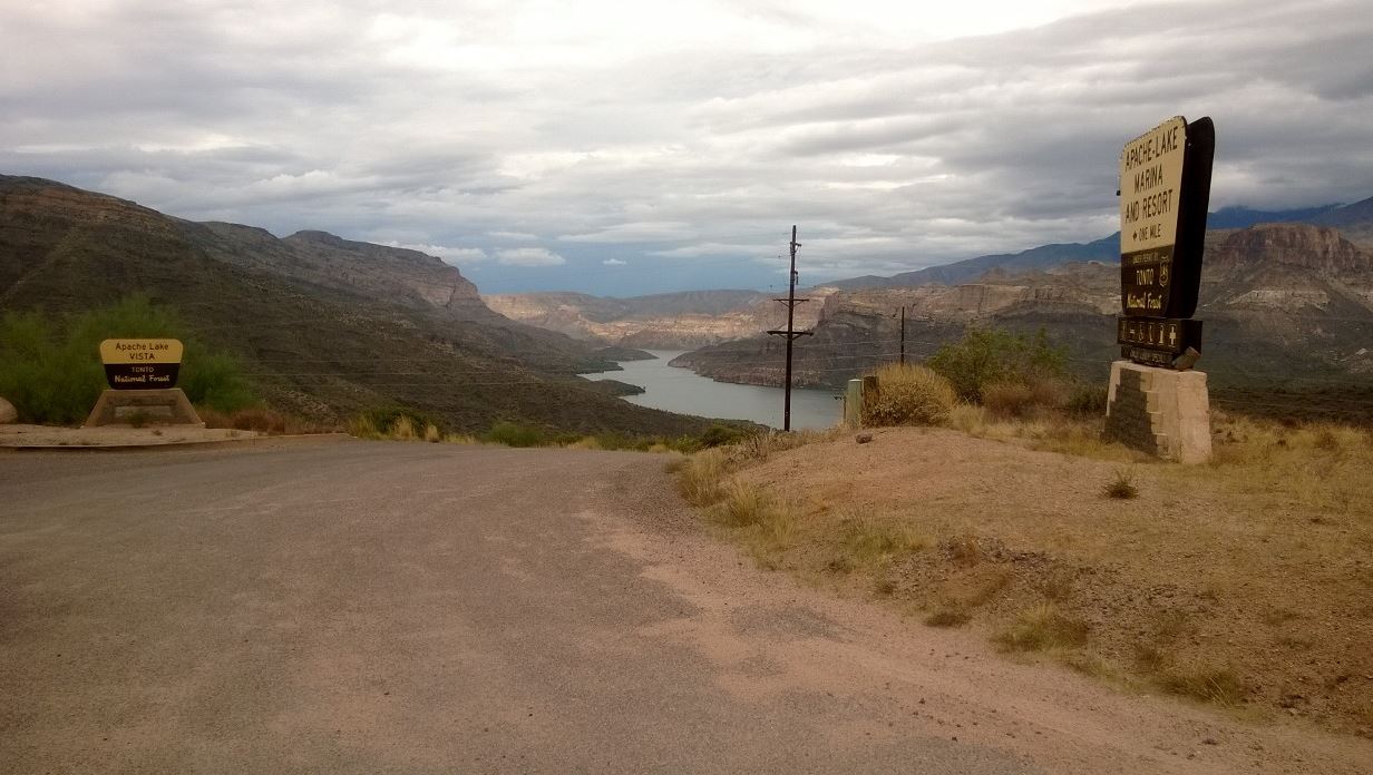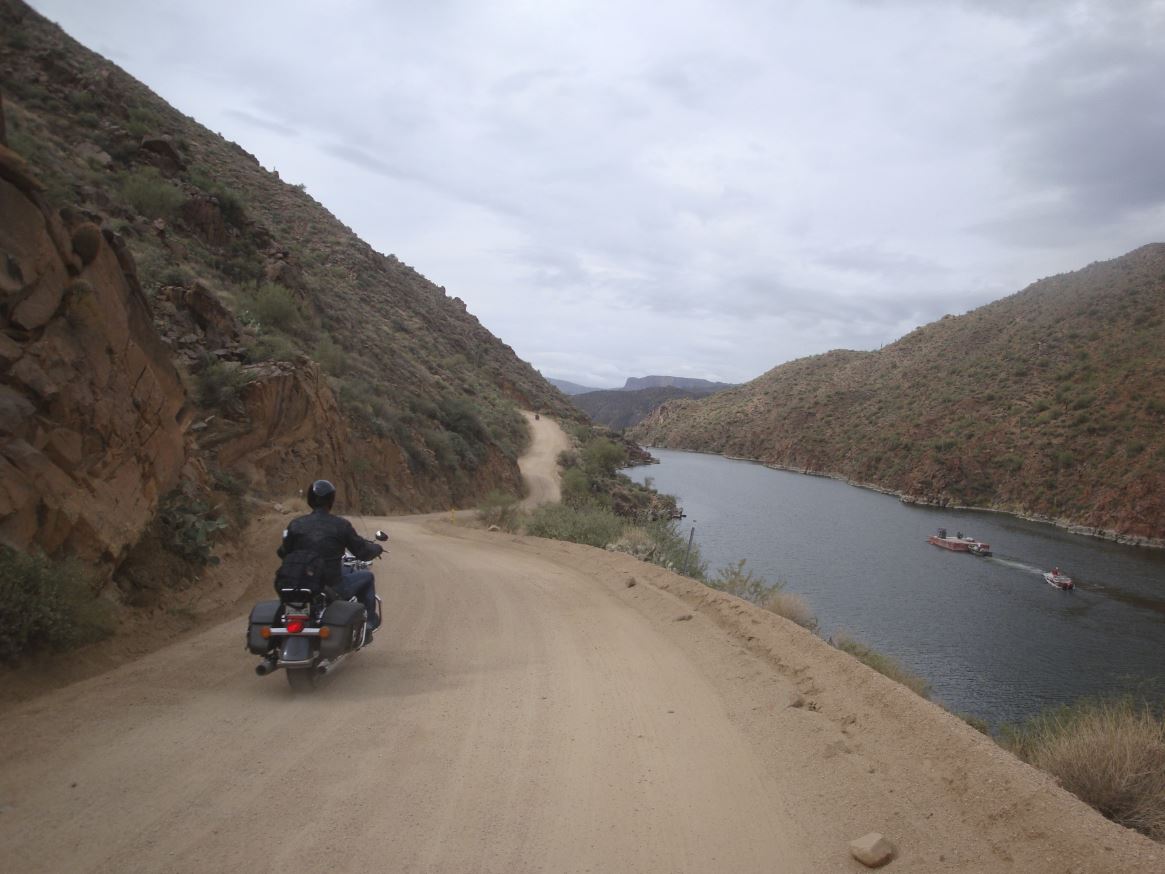 Petit matin chargé au niveau météo, mais le ciel reste malgré tout assez clément et nous prenons la 188 jusqu'à Rosevelt sur une route splendide qui se fraie un chemin entre les collines. A Rosevelt, prenons la 88 (Apache Trail sur la carte) et passons à côté d'un magnifique lac artificiel et d'un barrage impressionnant qui vaut le détour. Après un ou deux miles, le bitume fait place à une route de terre rouge qui semble être en travaux, mais après plusieurs miles comprenons que le mot "trail" signifiait "route de m... sans bitume". Au premier stop Pat rejoint Dom qui mène le bal et les deux partent dans un éclat de rire nerveux en se remémorant une autre expérience qui nous avait fait vivre 150km de caillasse sur une piste perdue dans la montagne quelques années auparavant suite à une maladresse de Fred ou Phil.. le cas est toujours ouvert au niveau responsabilités. Heureusement, PX a vu un panneau qui indiquait que le "trail" ne faisait que 25miles et effectivement, après une heure et demi de lutte nous retrouvons le bitume.. ouffff.. Le parcours fut ma fois assez sympa même si les bécanes furent un peu maltraitées et secouées par les trous, cailloux et autres tas de sable dans lesquels nous nous sommes parfois fait surprendre.. le trail suivait le lit d'une rivière, qui alimentait Apache lake, de toute beauté dans un décor montagneux très varié et surtout très SAUVAGE...