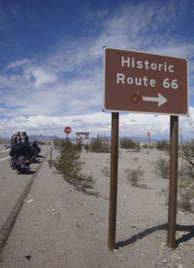 Le départ de Las Vegas se fait sous un ciel chargé contre toute attente. Le désert se montre sous un jour inhabituel et l'horizon se présente mal.. Après une sortie sans histoire, nous reprenons la 15 que nous quittons après 1 heure env. pour rejoindre la mythique 66 en direction de Cima et Amboy. Toutefois, nous sommes forcés de faire une halte dans une sympathique station d'essence dans l'espoir que les cieux soient plus cléments. Après une heure le temps se lève un peu et reprenons cette belle route pour atteindre finalement Amboy (Roy's café) au sec et faisons une halte "photos top model" au milieu d'un groupe de bikers "germaniques".