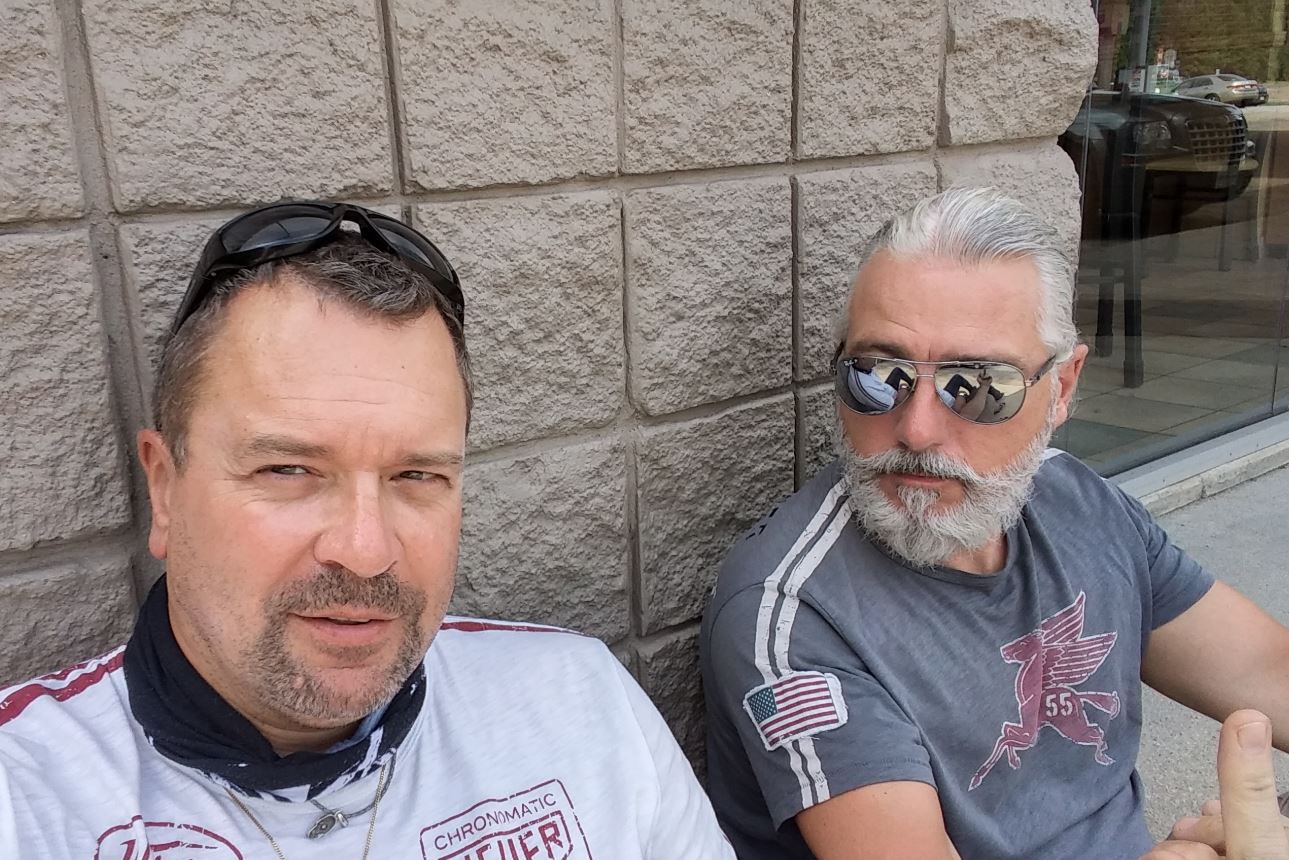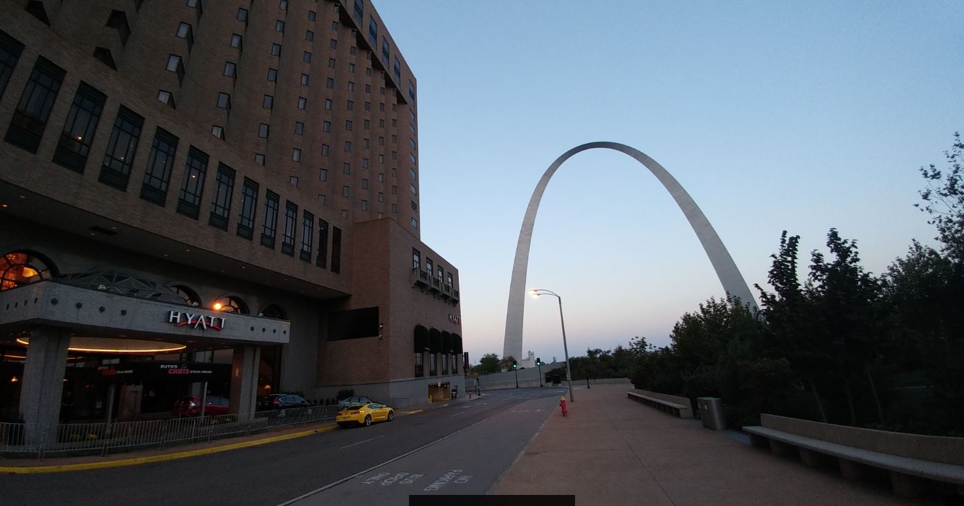 Le trip démarre par un réveil à 7h00, Phil se lève le premier et s'active déjà alors que Dom traine sous la couette en ayant un peu mauvaise conscience de ne rien entreprendre si ce n'est 10min. de physio sur les conseils de son médecin pour les douleurs dorsales d'un vieux biker. Bref, douche, préparation des sacoches et ptit déjeuner rapide au Starbuck de l'hôtel. Nous partons ensuite pour la concession qui se trouve à 10min en prenant un taxi afin d'être un peu plus tôt que prévu chez Eagle Rider. Pourtant sur place à 9h00, il y avait déjà des groupes de bikers touristes qui faisaient la queue. Finalement nous touchons nos montures vers les 10h30 et après l'ajout d'un accessoires "reposes pieds" sur la bécane de Dom que le gars lui vend USD 40.-- nous partons sur la route direction le sud, ou nous retrouvons assez rapidement la route 66 par Joliet et la 55 et 53 jusqu'à Pontiac, ville mythique de la marque automobile. Nous hésitons à visiter le musée local mais finalement nous tournons un peu dans la vieille ville au milieu d'une exposition plein air de véhicules vintage et anciens camions de l'armée US. Nous rentrons dans un bar US typique pour descendre notre premier BURGER US bien gras accompagné d'une bonne bière bien fraîche. La chaleur était déjà au RDV, d'ailleurs, elle ne nous quittera plus durant tout le trip, une moyenne de 30 degrés. Nous roulons direction St-Louis et arrivons enfin sur le site avec l'aide du GPS de Dom pour retrouver le Hyatt Regency St-Louis at the Arch Hotel rapidement au bord du Mississipi et en face de la fameuse arche, symbole de la ville.