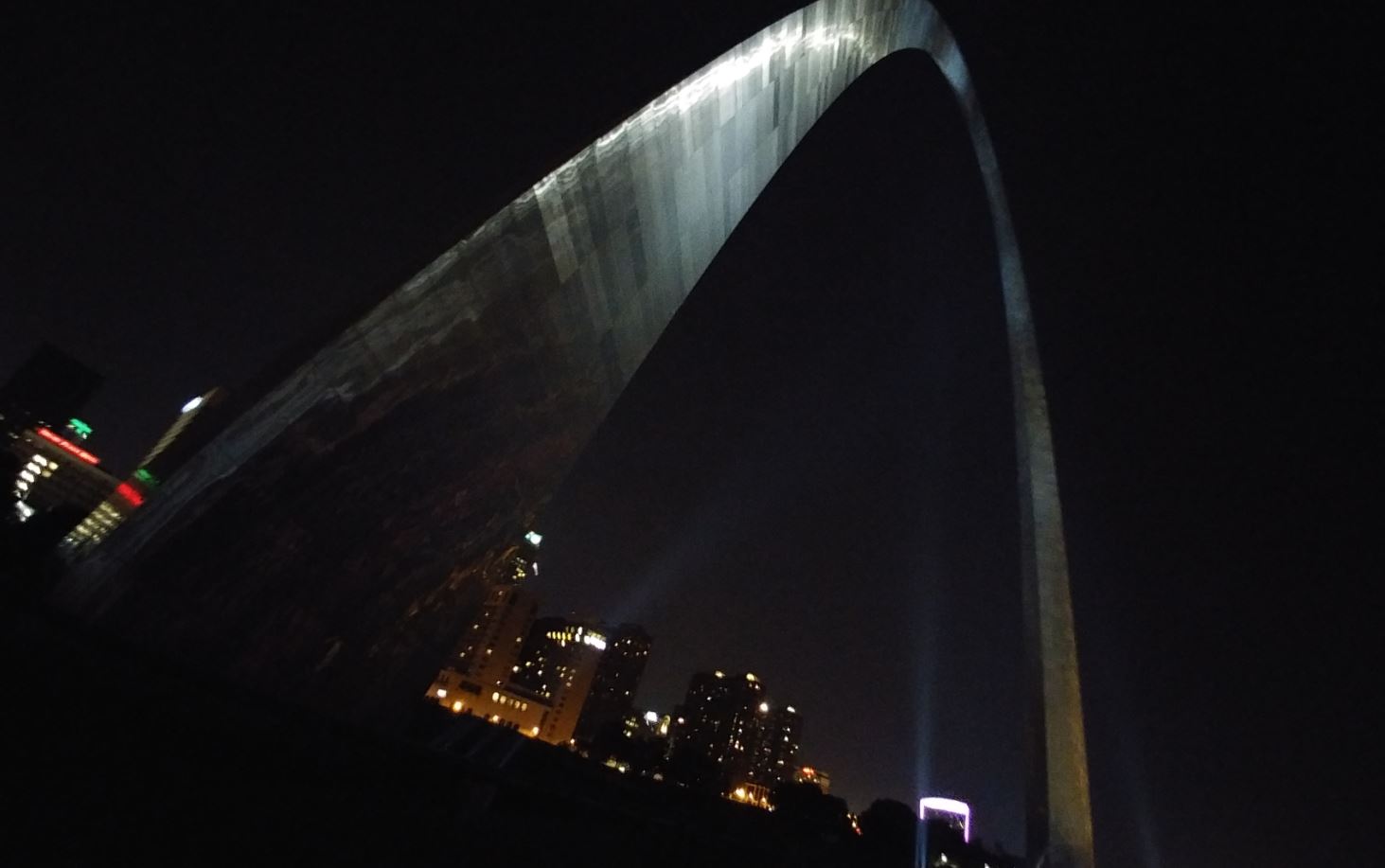 Après une courte digestion le longs des trottoirs pour revenir en direction de l'hôtel, nous décidâmes de faire un saut dans le parc pour voir l'arche de près. En contournant quelques travaux et en trouvant le passage par-dessus la higway nous tombons sur le site dans la douceur de la nuit et avec la même constatation qu'au centre-ville, à savoir que nous étions à nouveau à peu près seuls dans le coin. Quelques minutes après avoir touché le but, une patrouille de flics nous aborde pour nous signifier que le parc était fermé et qu'il fallait rapidement quitter les lieux. En partant, une autre patrouille à l'opposé nous fait une remarque similaire.
