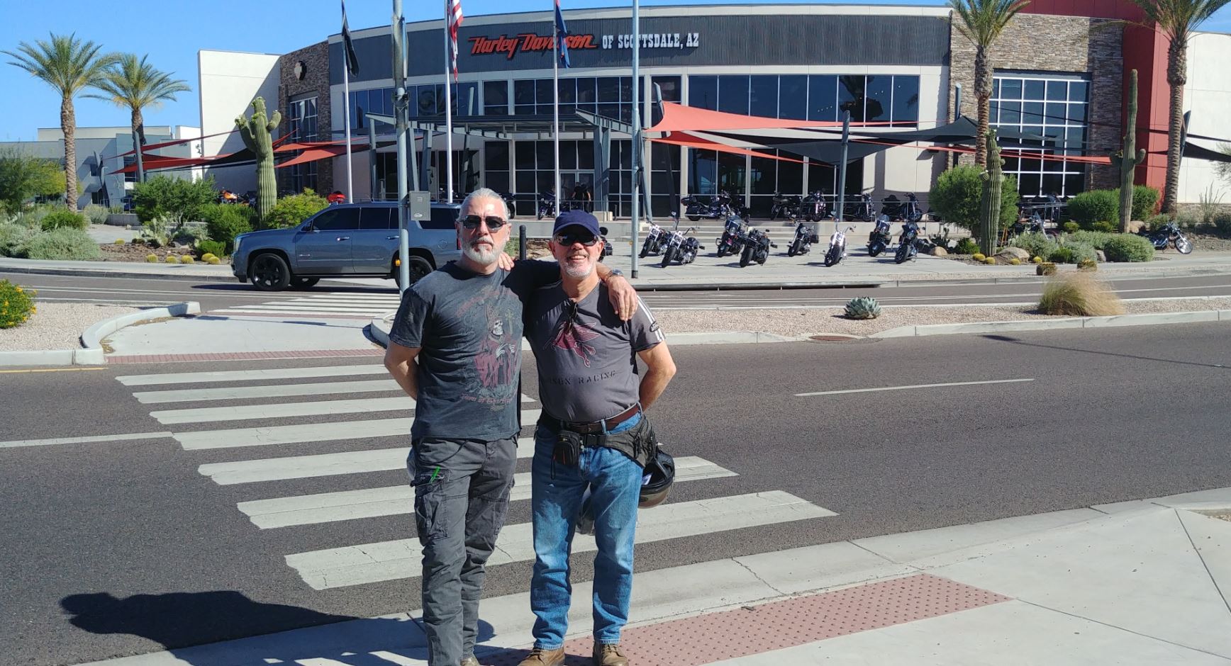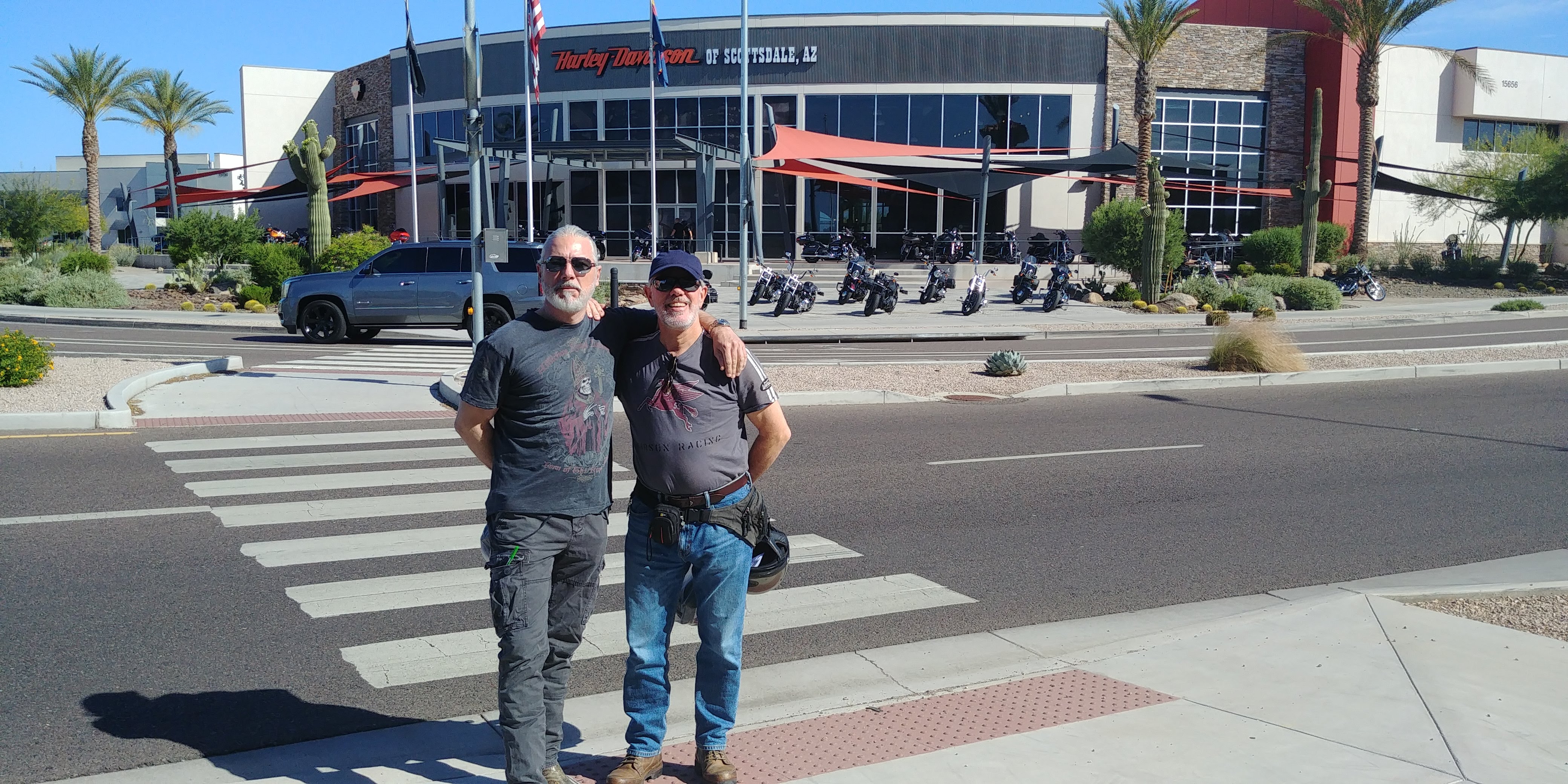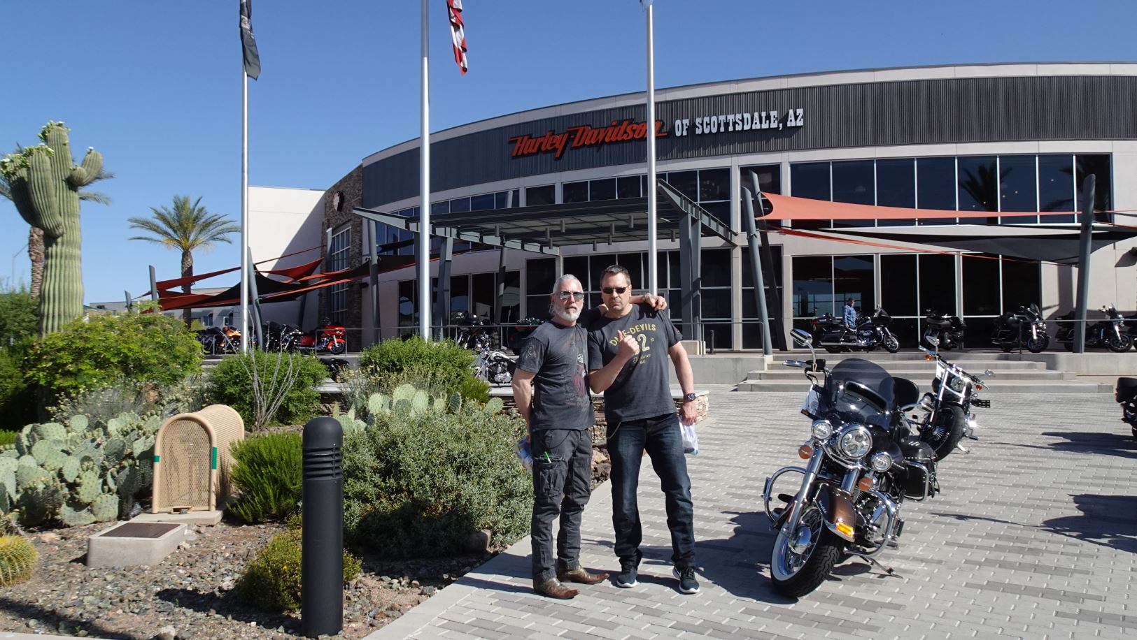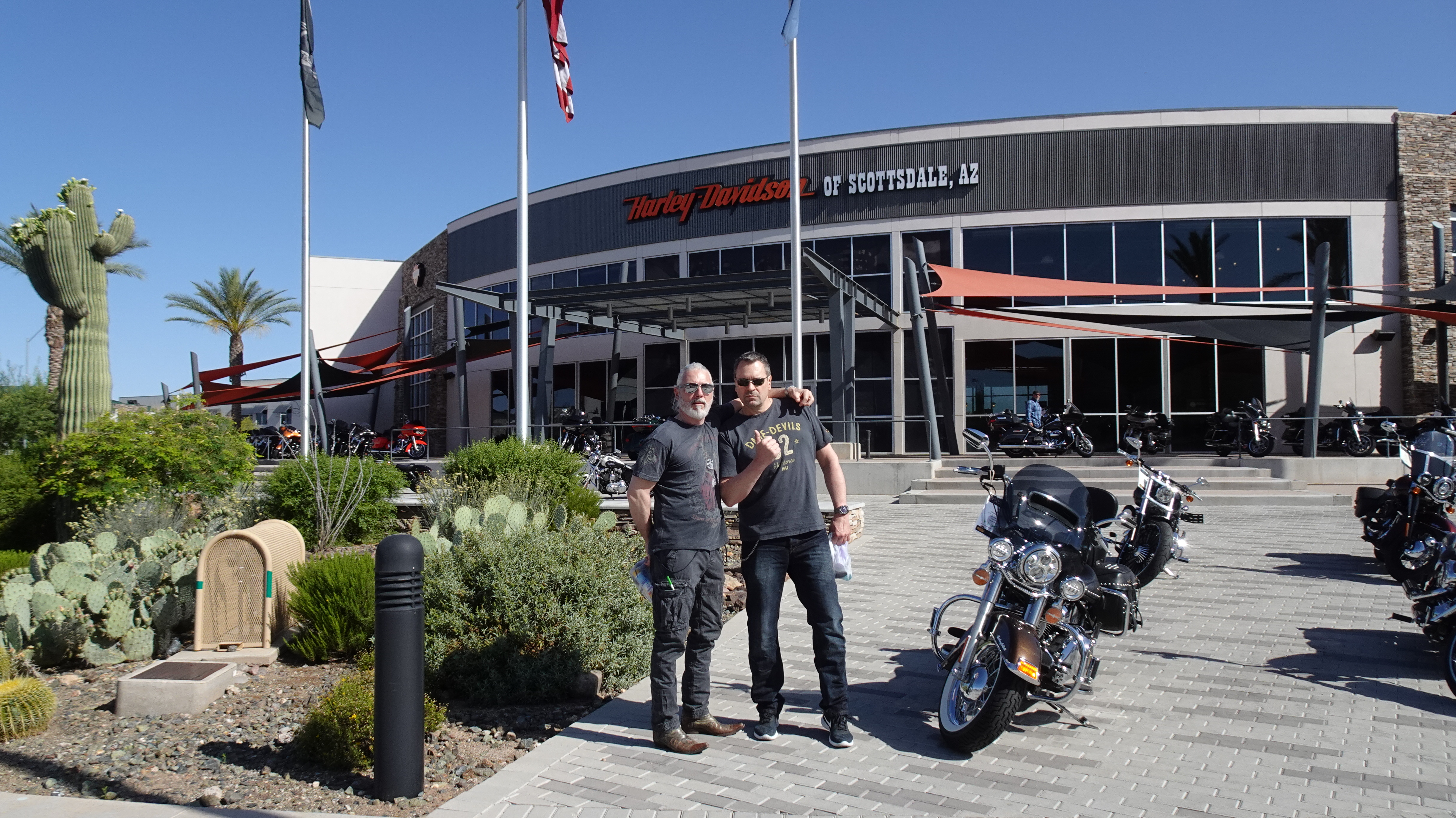 Diane debout vers 6h00 sans difficultés compte tenu du jet lag et petit déj rapide à l’hôtel. Ensuite, départ tôt du Holiday Inn & Suites Scottsdale North pour un passage au Walmart du coin afin de racheter quelques babioles que nous avons dû laisser dans nos valises à Genève. Ensuite, nous partons à la concession pour toucher nos trois motos, une street Glide pour Dick avec environ 3000miles au compteur et deux Road Glides pour Phil et Dom toutes neuves. Nous faisons notre check-in moto et encore un peu de shopping dans la concession (une des plus importantes aux USA) et enfourchons nos bécanes direction le Boot Barn local. Dom se rachète une paire de bottes et Phil également. Quelques t-shirts sympas et départ pour le désert.