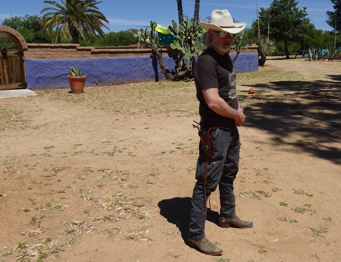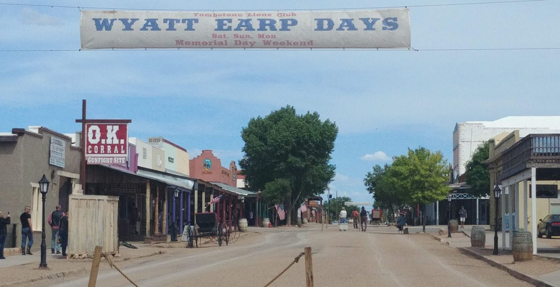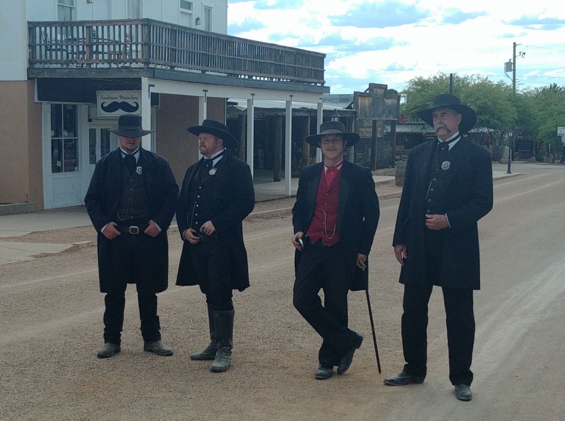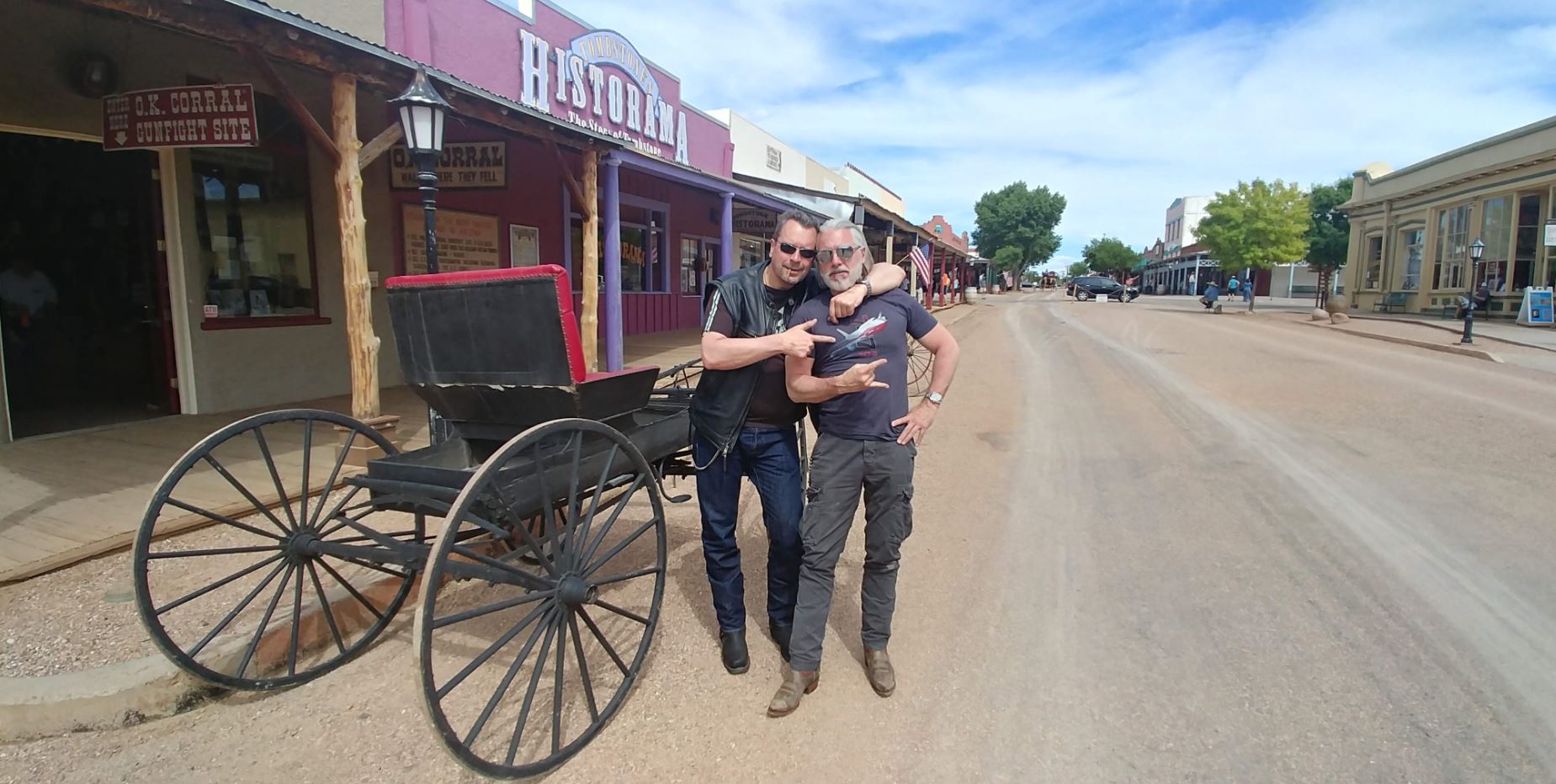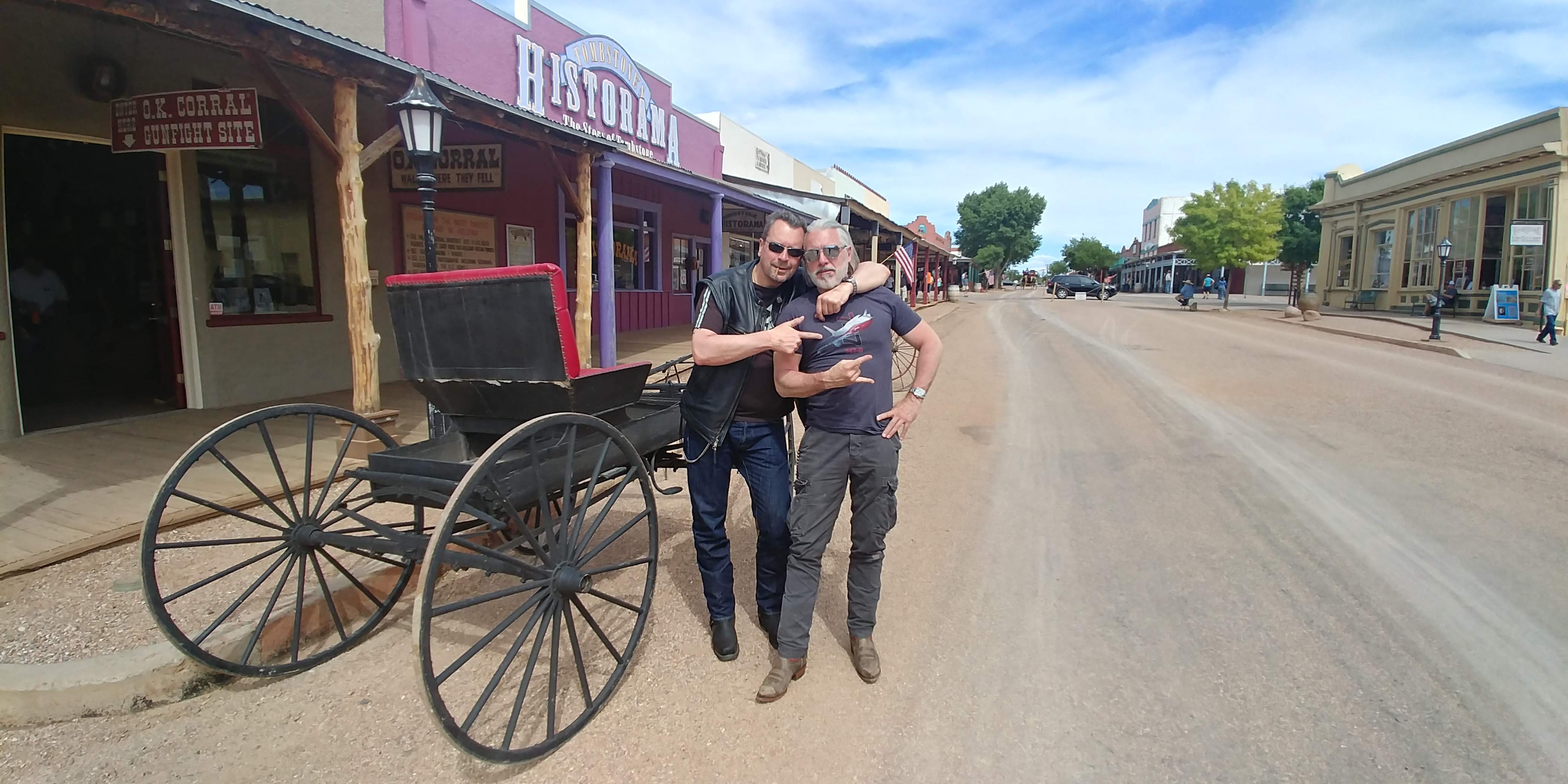 Vers les 14h00, reprenons la route pour notre destination du jour, la fameuse ville de Tombstone, là où s’est déroulé le fameux règlement de compte à O.K. Corral. Avant même de prendre nos chambres au Virgil’s corner Bed & Breakfast, nous remontons la rue principale construite comme autrefois avec Bars, magasins western et autres musées etc.. Nous prenons un verre bien mérité au Big Nose Kate’s Saloon avant de retourner à notre B & B pour poser nos affaires et souffler un peu. Retour en ville un peu plus tard pour du shopping après avoir tourné une petite scène virile dans la rue principale sur fond de couché de soleil. Retour en ville pour l’achat des fameux chapeaux de cow-boys que nous ne quitterons plus pour le reste du ride. Nous décidons de nous inscrire à la fameuse reconstitution de « règlement de compte à O.K. Corral », une sorte de représentation en plein air avec les décors de l’époque et des acteurs motivés et bruyants. Bref, sympathique moment !