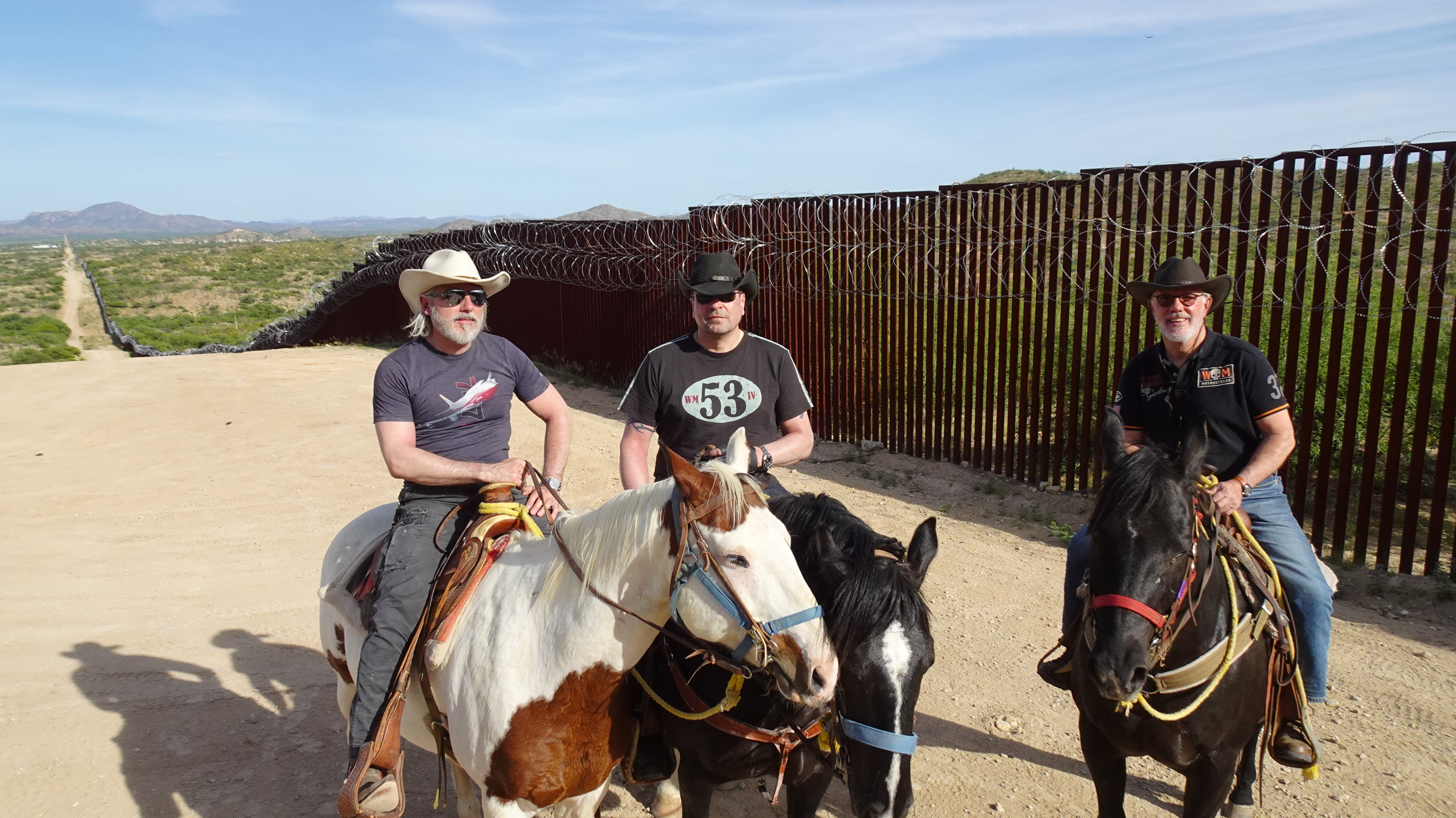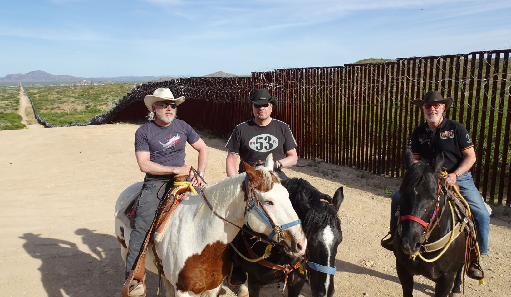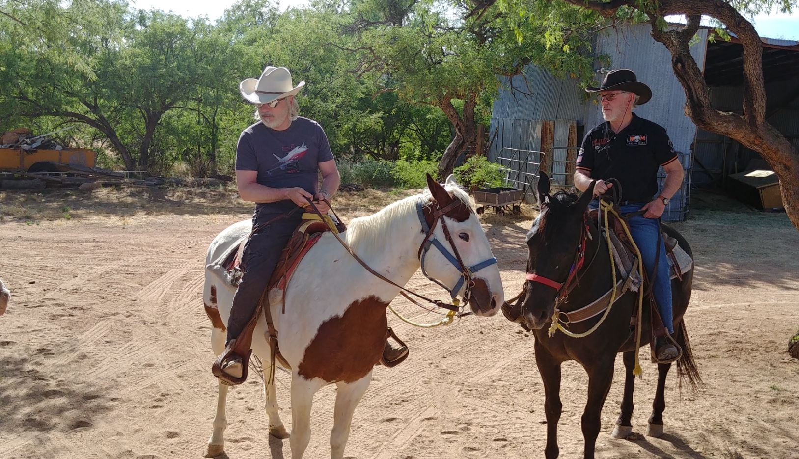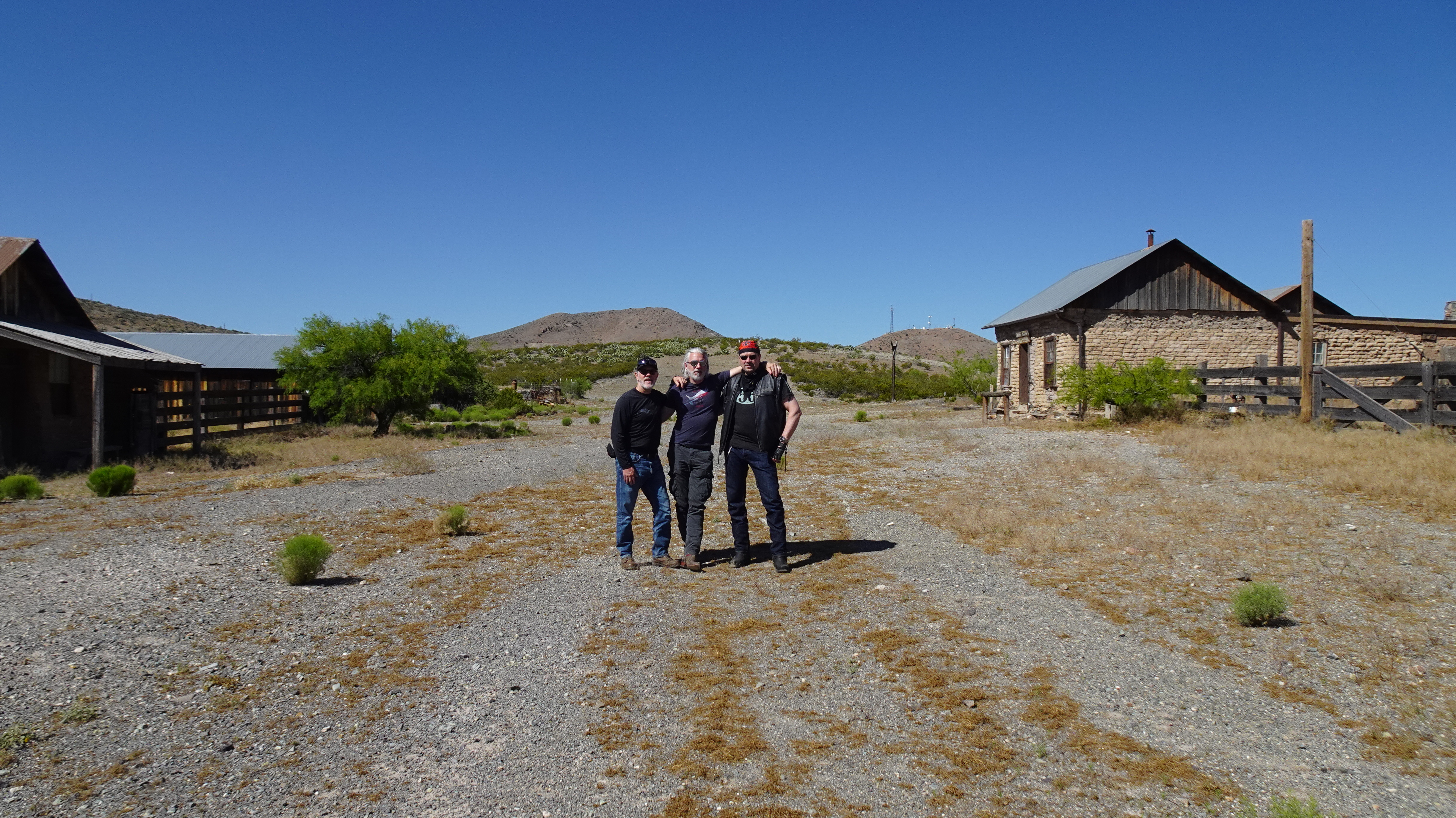 Tout d’abord, nous prenons nos chambres, Dom s’attribue celle que préférait John Wayne quand il venait tourner des films dans le coin. Phil et Dick se partagent la seconde pièce pas mal non plus. Dick part faire un plongeon dans la piscine du Ranch et nous regagnons vers 16h00 le corral pour une ballade sur trois canassons à peu près dociles, accompagnés d’une jeune cavalière pour nous apprendre rapidement comment maîtriser les bestioles. Nous partons pour quasi deux heures de ride dans les buissons et cactus du coin jusqu’à longer la barrière qui sépare les USA du Mexique. Moment assez improbable, mais très sympathique. Retour au Ranch, un peu cassés car les scelles, bien que confortables, n’encaissent pas aussi bien les chocs que celles de nos Harleys.