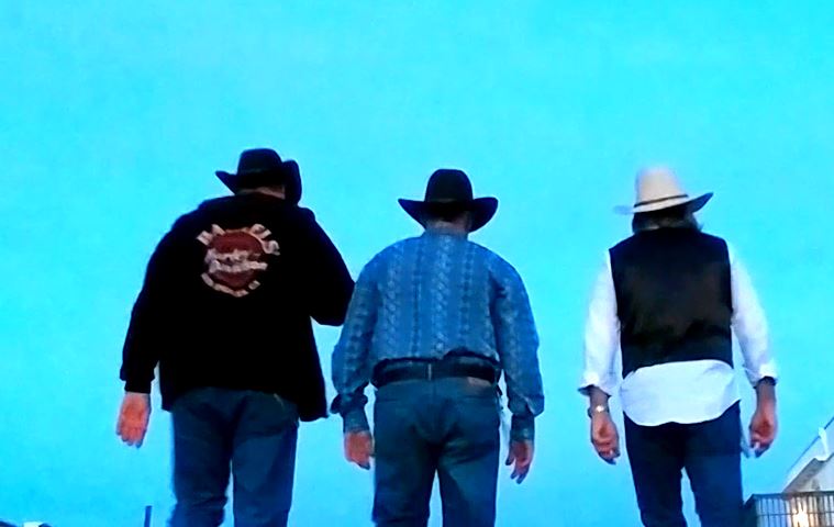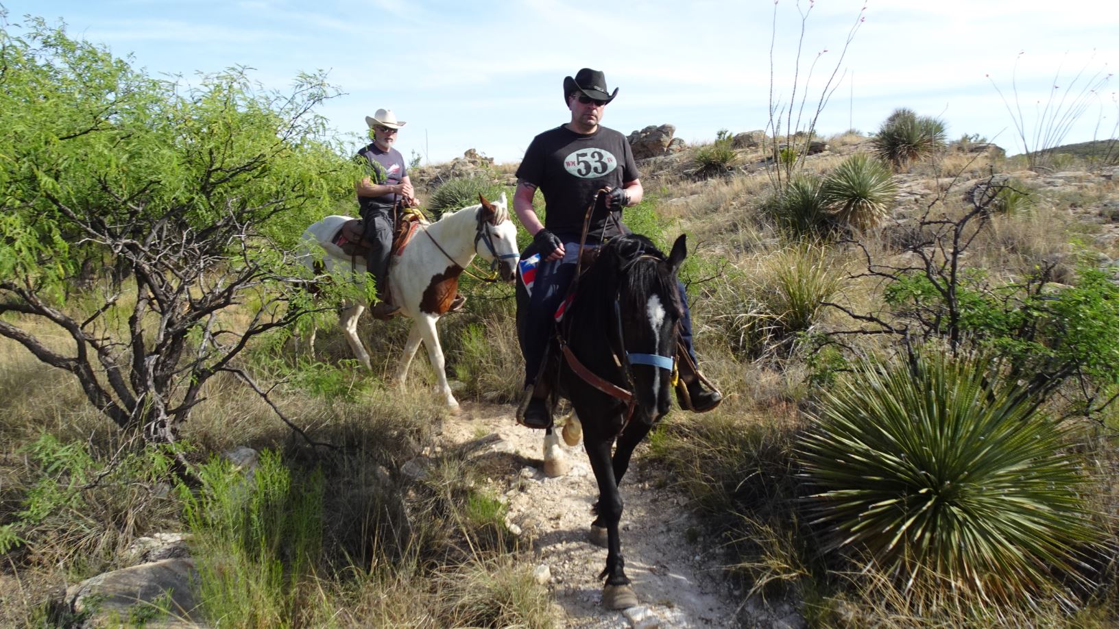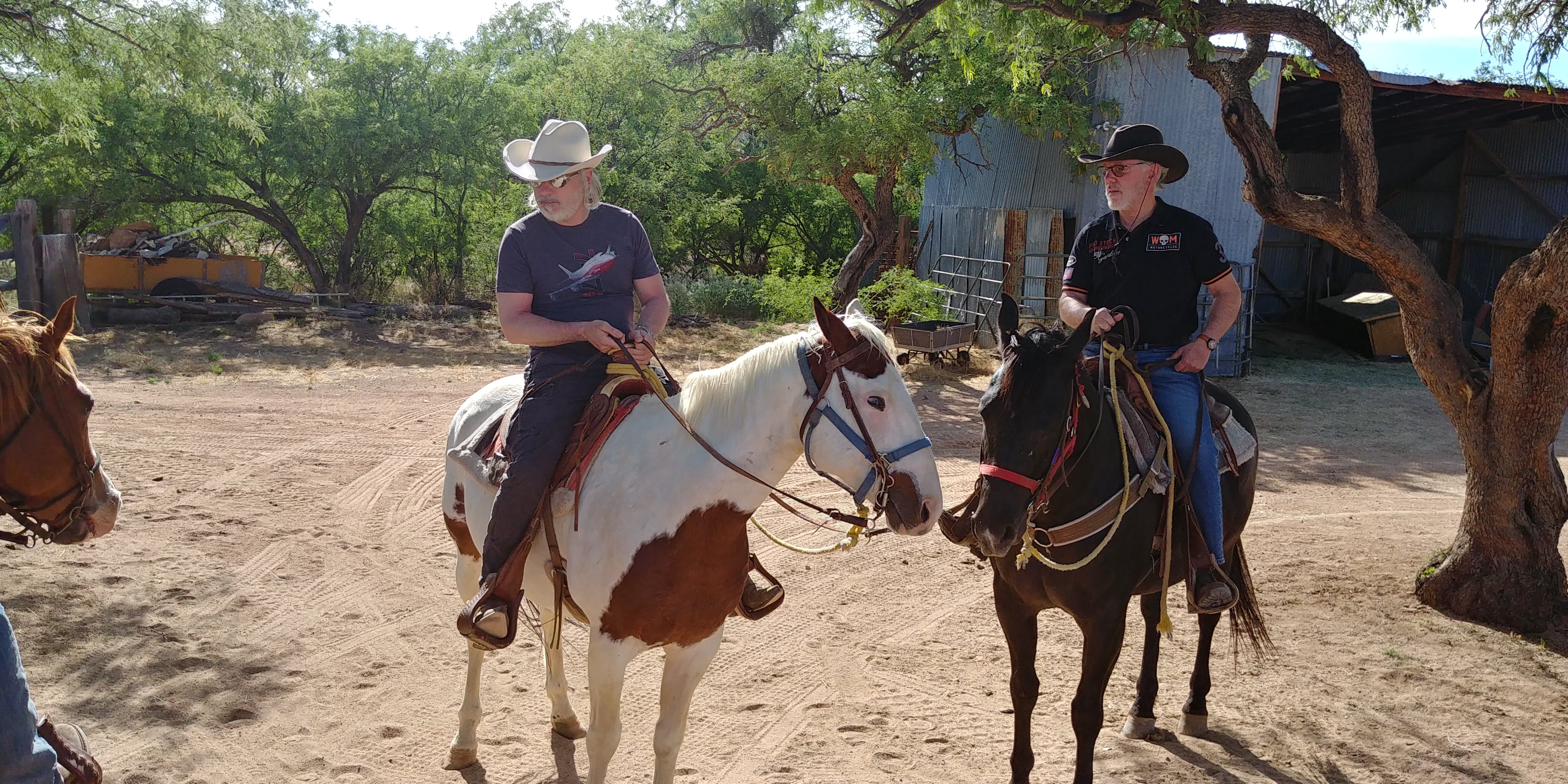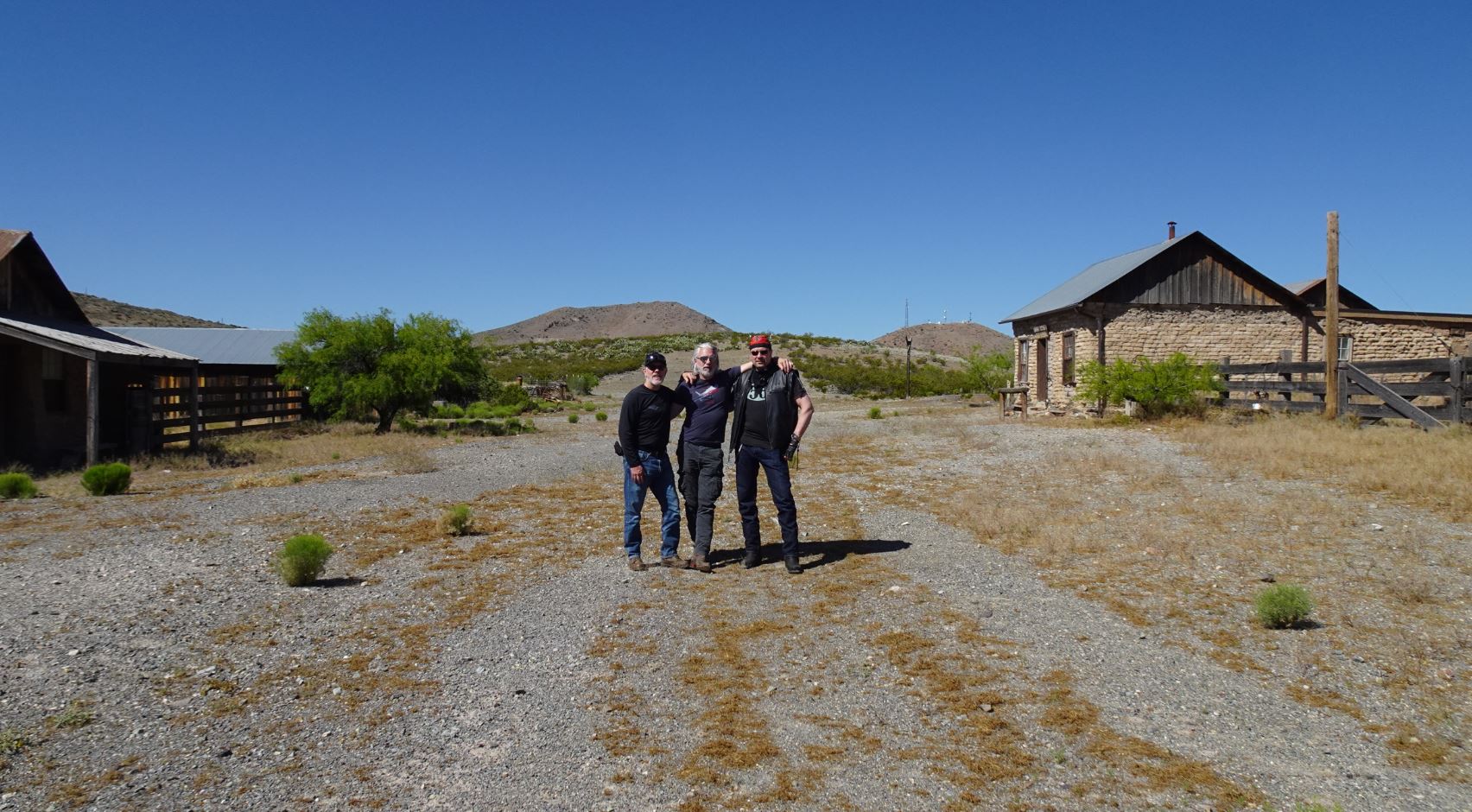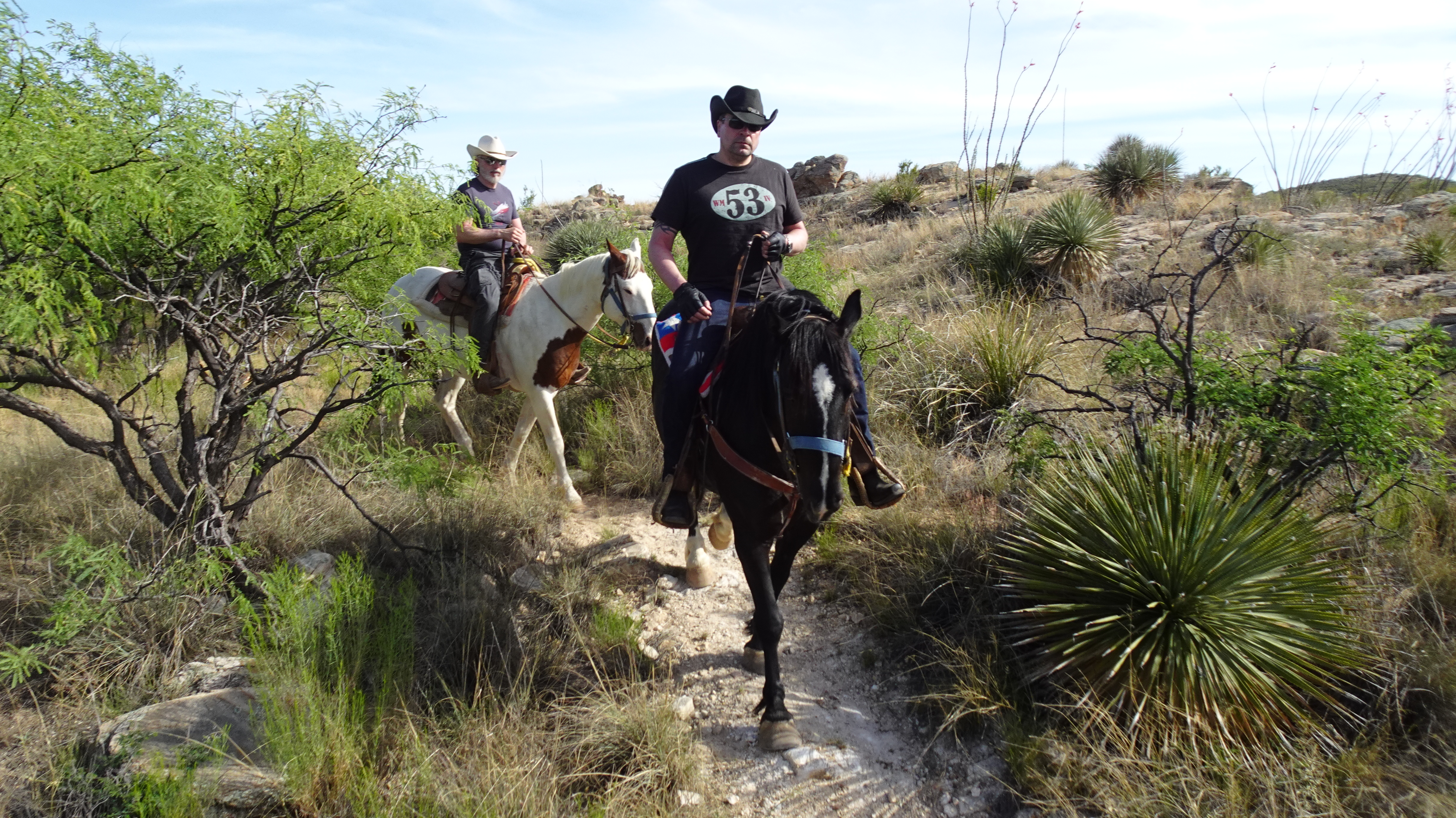 Tout d’abord, nous prenons nos chambres, Dom s’attribue celle que préférait John Wayne quand il venait tourner des films dans le coin. Phil et Dick se partagent la seconde pièce pas mal non plus. Dick part faire un plongeon dans la piscine du Ranch et nous regagnons vers 16h00 le corral pour une ballade sur trois canassons à peu près dociles, accompagnés d’une jeune cavalière pour nous apprendre rapidement comment maîtriser les bestioles. Nous partons pour quasi deux heures de ride dans les buissons et cactus du coin jusqu’à longer la barrière qui sépare les USA du Mexique. Moment assez improbable, mais très sympathique. Retour au Ranch, un peu cassés car les scelles, bien que confortables, n’encaissent pas aussi bien les chocs que celles de nos Harleys.