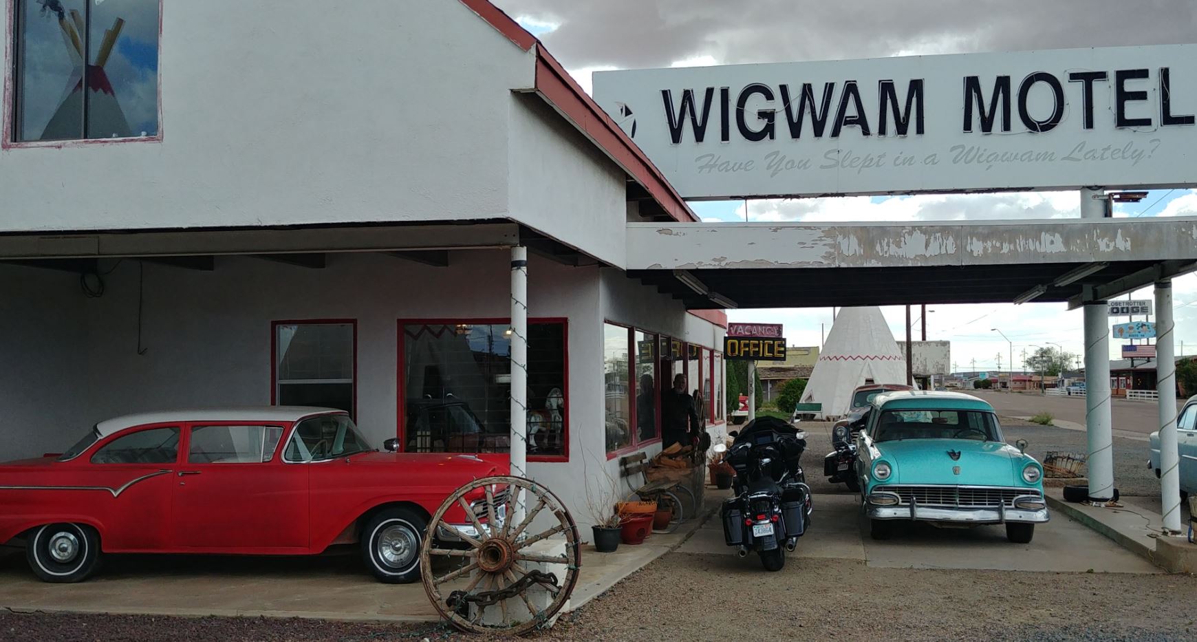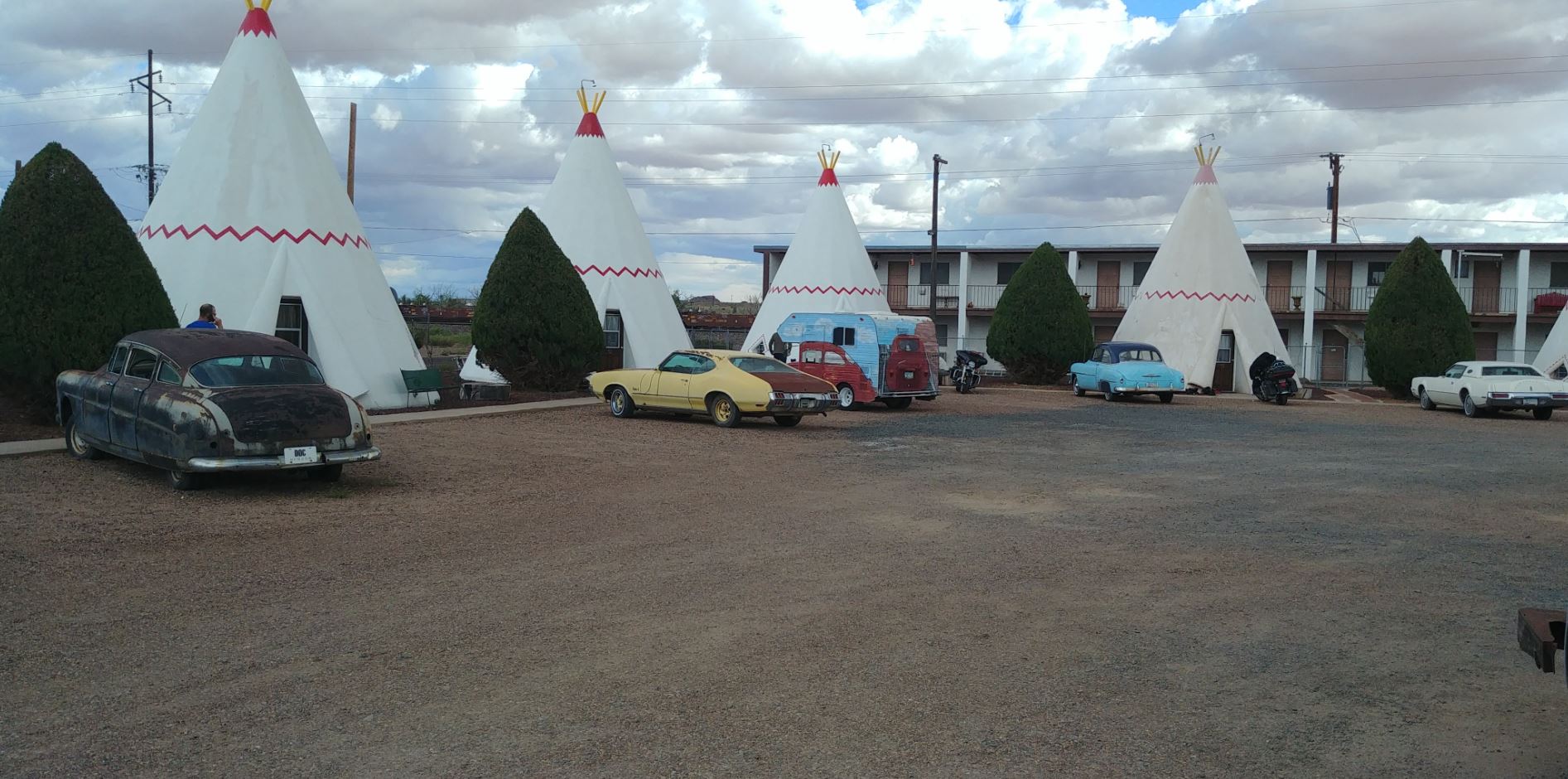 Le temps reste incertain mais nous décidons de prendre le risque de rouler en direction de notre prochaine destination pour la soirée et traversons un rideau de pluie (sans pèlerines restées également à Genève). Après une bonne douche et une chaleur relative, nous serrons les dents et arrivons sans trop de mal au Wigwam Motel à Holbrook, AZ. Hôtel composé de diverses fausses tentes d’indiens en béton assez rustiques, mais finalement un site très original pour passer la nuit. Phil et Dick se partagent un tipi et Dom profite tout seul du sien. Juste après notre arrivée, la pluie se met à tomber fort et nous nous inquiétons pour la suite du voyage sachant que les prévisions n’étaient pas bonnes. C'est bien la 1ère fois que nous enclenchons le chauffage dans les chambres au lieu de la climatisation !!