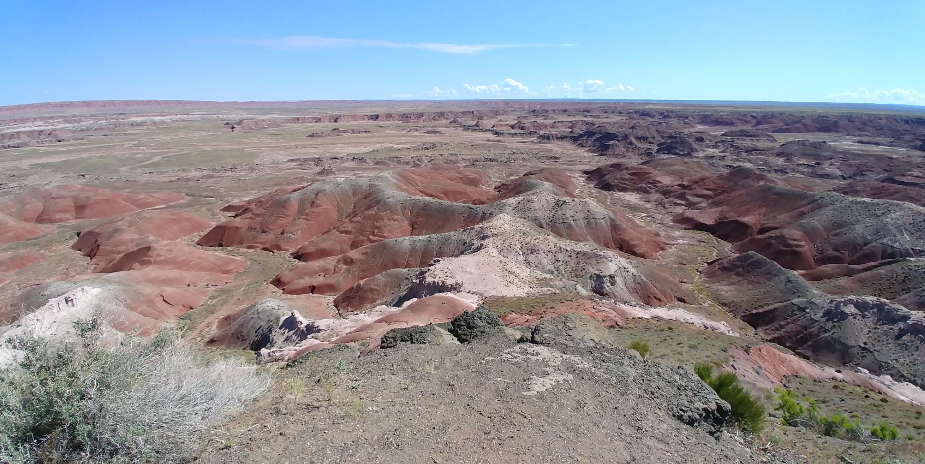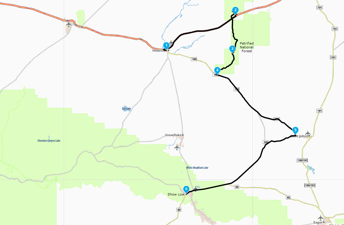 Levé tôt car toujours sous l’emprise du Jet Lag. 7h12 on roule déjà direction du Denny’s local pour un petit déjeuner classique. Ensuite on repart et on fait le plein pour rejoindre notre destination, à savoir « Parc National de Petrified Forest ». Par chance, les prévisions météo de la veille se vérifient et nous commençons par rouler sous un magnifique soleil et un horizon favorable, jusqu'en milieu de journée ou les orages sont de retour.