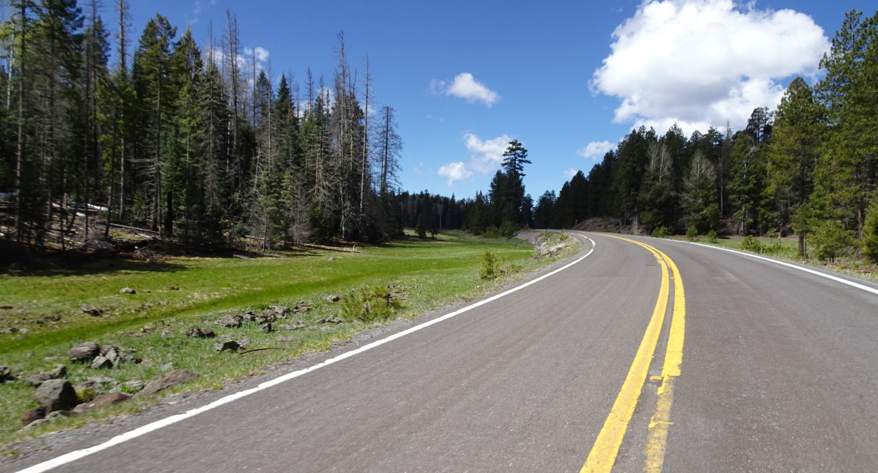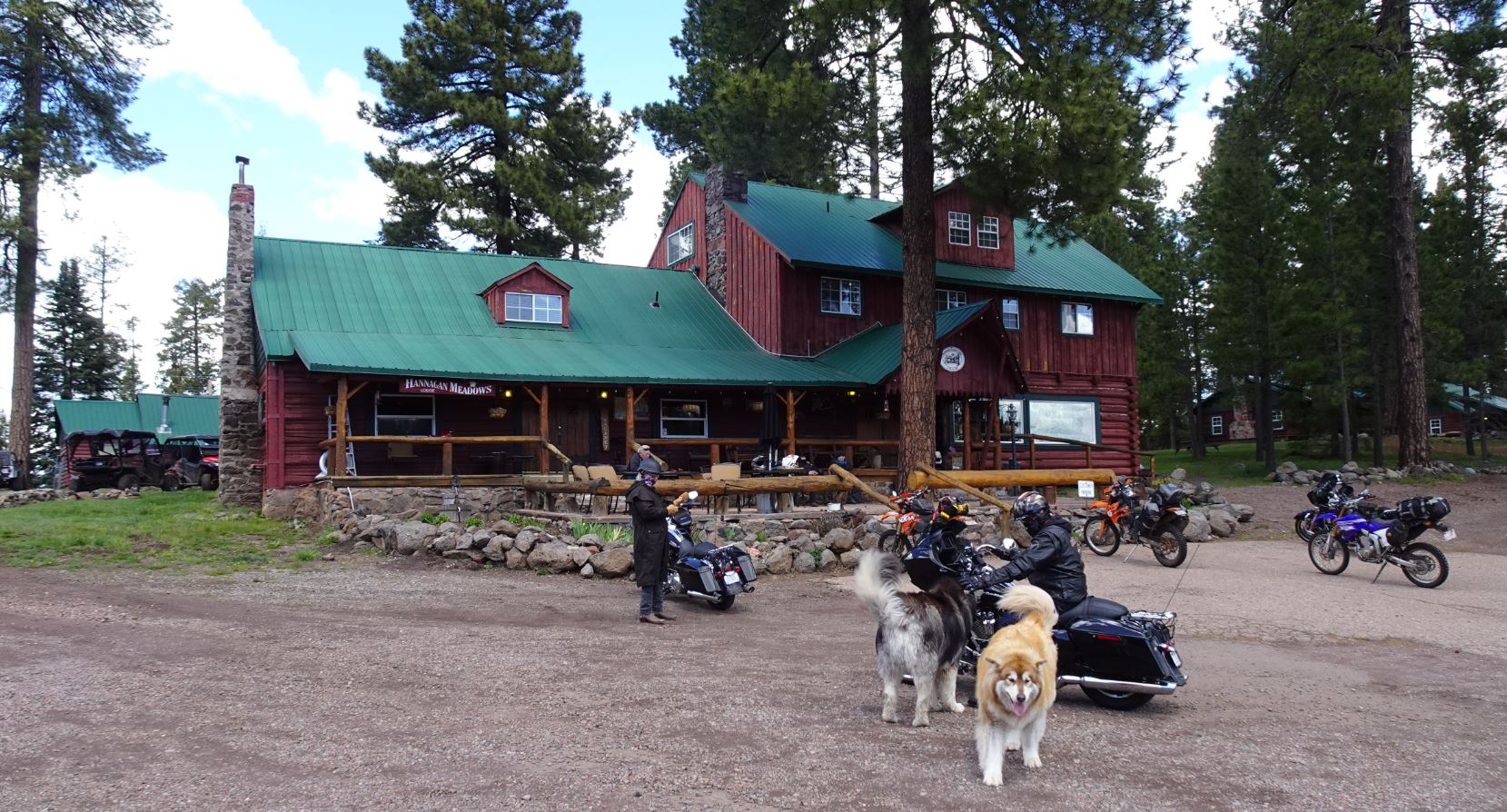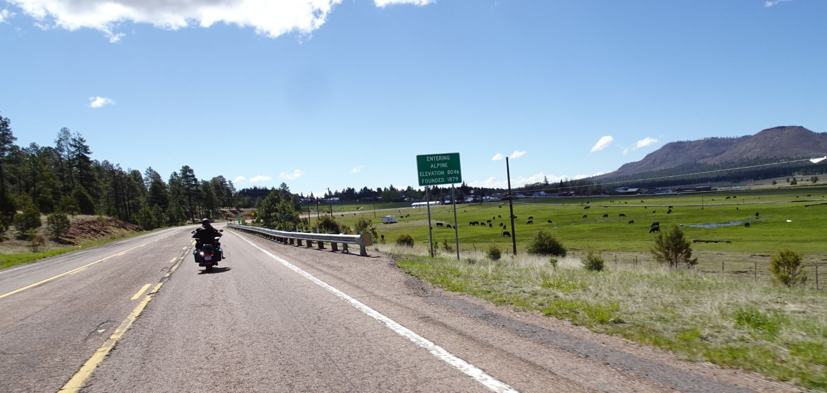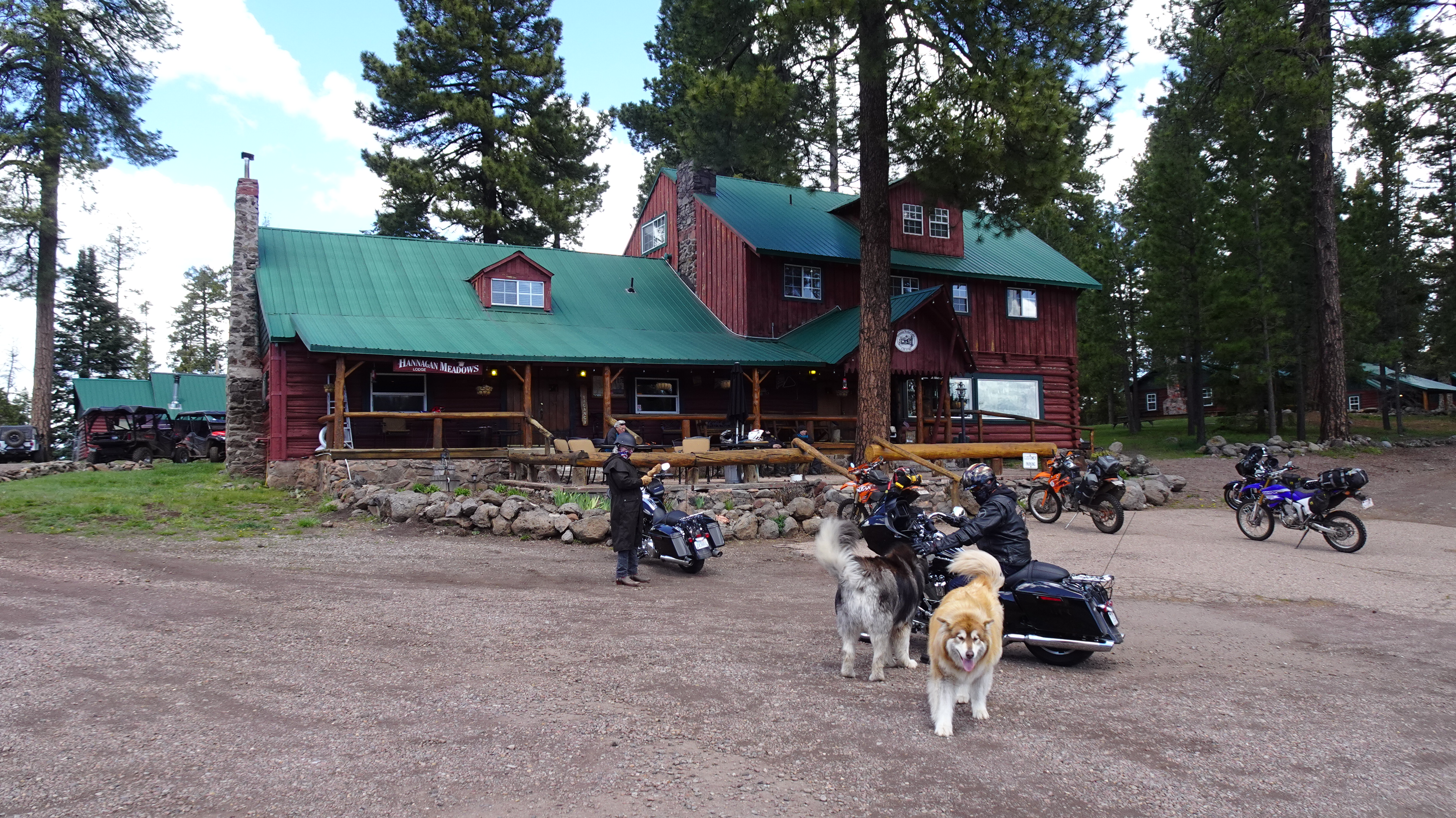 On se lève et départ 7h30 pour prendre une des plus belle route des USA, à savoir la 191 dans le comté d’Apache. Une route splendide qui nous amène à près de 3000m d’altitude où toute la neige n’a pas encore fondu. Nous traversons des paysages incroyables et au sommet, faisons un stop réparateur dans le Hannagan Meadow Lodge, une sorte de refuge d’altitude très Western ou nous pourrions croiser ours, loups et plein d’autres bestioles de ce type. La tenancière nous sert rapidement des cafés bien chauds et une déicieuse tarte aux pommes, devant un feu pour nous réchauffer. Nous rencontrons des bikers atypiques qui traversent la région sur des motos tout terrain à travers les forêts. Forts les gars !