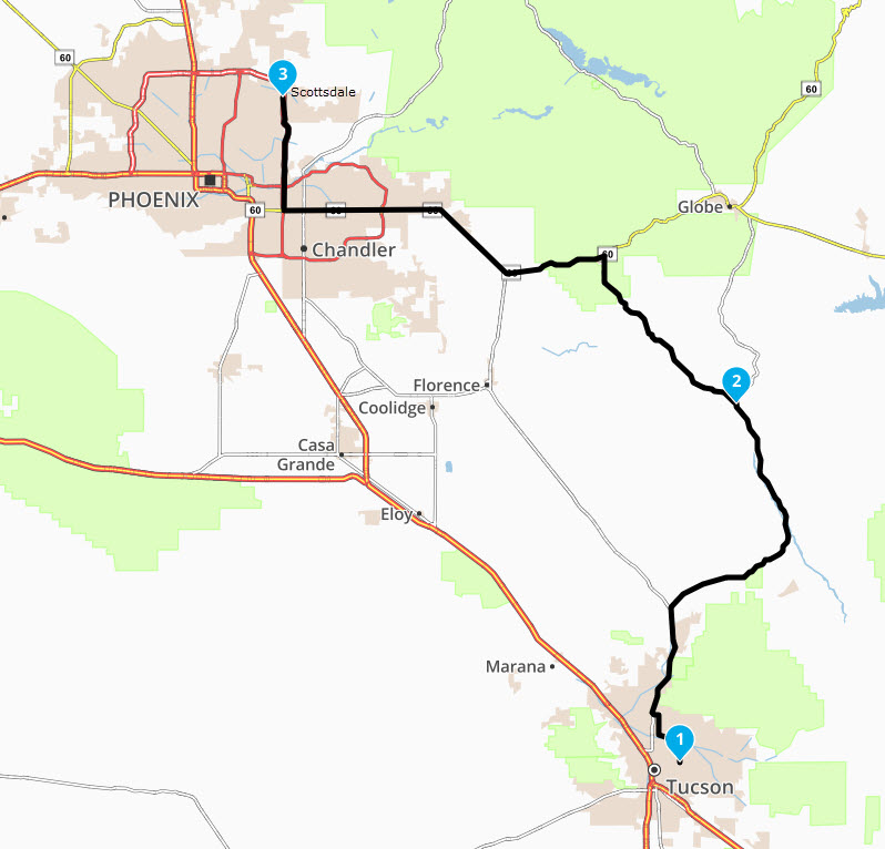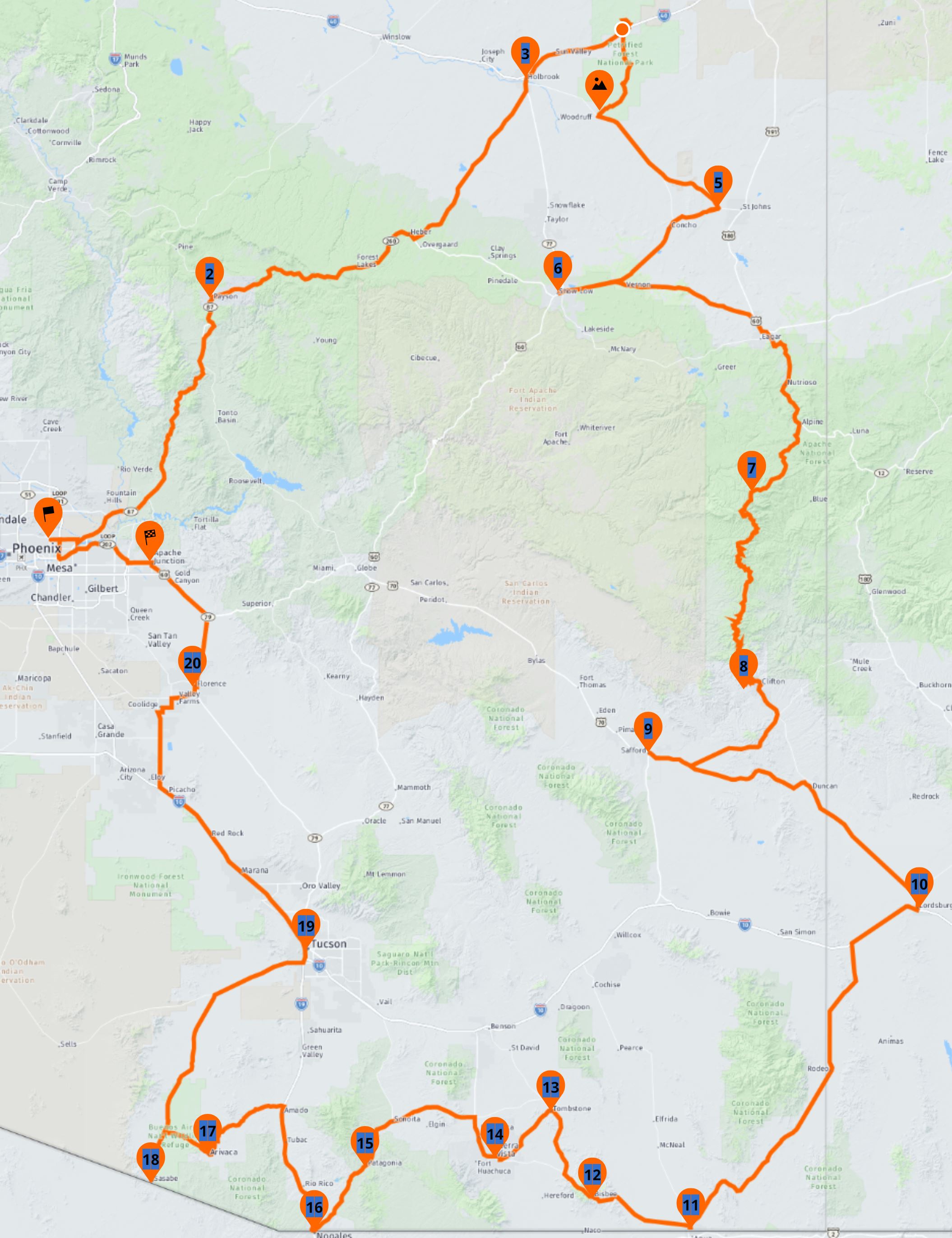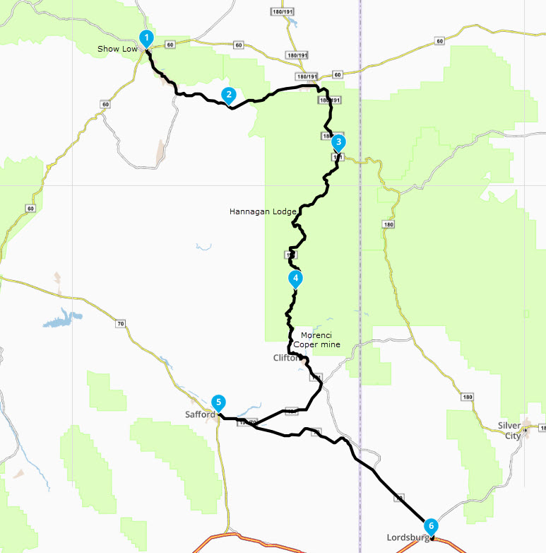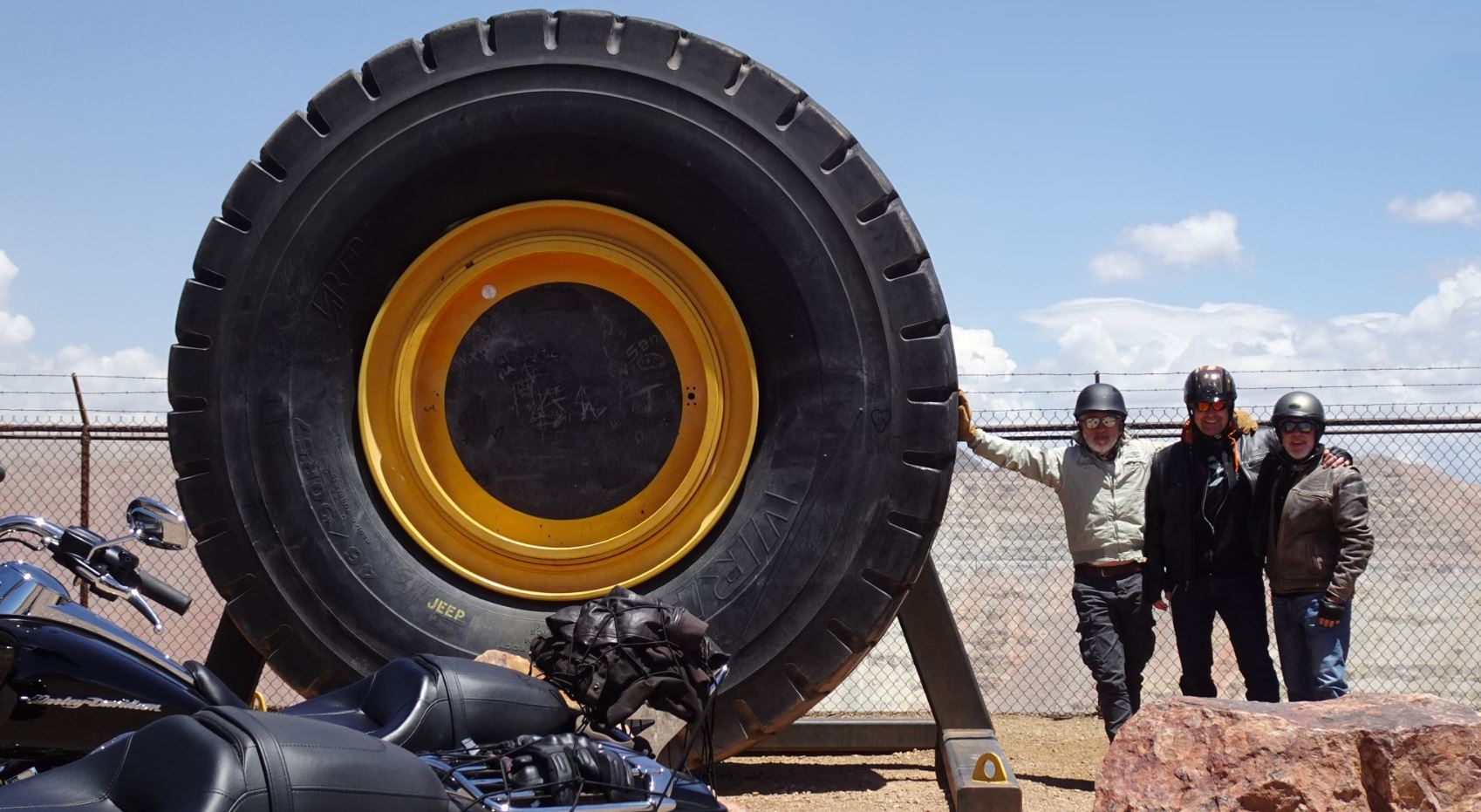 Après 40min de pause, nous serrons les dents et repartons sur la 191 pour une descente mémorable et rejoignons les mines majestueuses de Morenci/ Clifton, AZ. Indescriptible, monumental, juste immense, ces mines de cuivre à ciel ouvert sont impressionnantes de gigantisme, sur des km des tas de gravats de cailloux concassés accumulés depuis 100ans, une couleur rouille avec des dégradés superbes, des machines-outils d’un autre monde, des camions hors normes avec des roues hautes comme des maisons etc.. Nous traversons donc ce monde lunaire ou plutôt martiens avant d’atterrir dans le village de mineur au bas de la vallée. Là aussi, c’est toute une région qui ne travaille que pour la mine, dans des conditions qui doivent être rudes et dans un paysage poussiéreux comme jamais. Nous continuons notre route jusqu’au JD’s Corner sports bar & Grill dans une petite ville un peu plus loin à Thatcher, AZ, juste à côté de Shaford. Etant donné que nous avons perdu de l’altitude, nous retrouvons un temps plus clément et une relative douceur. A partir de là le reste du parcours sera toujours agréable avec des températures estivales.