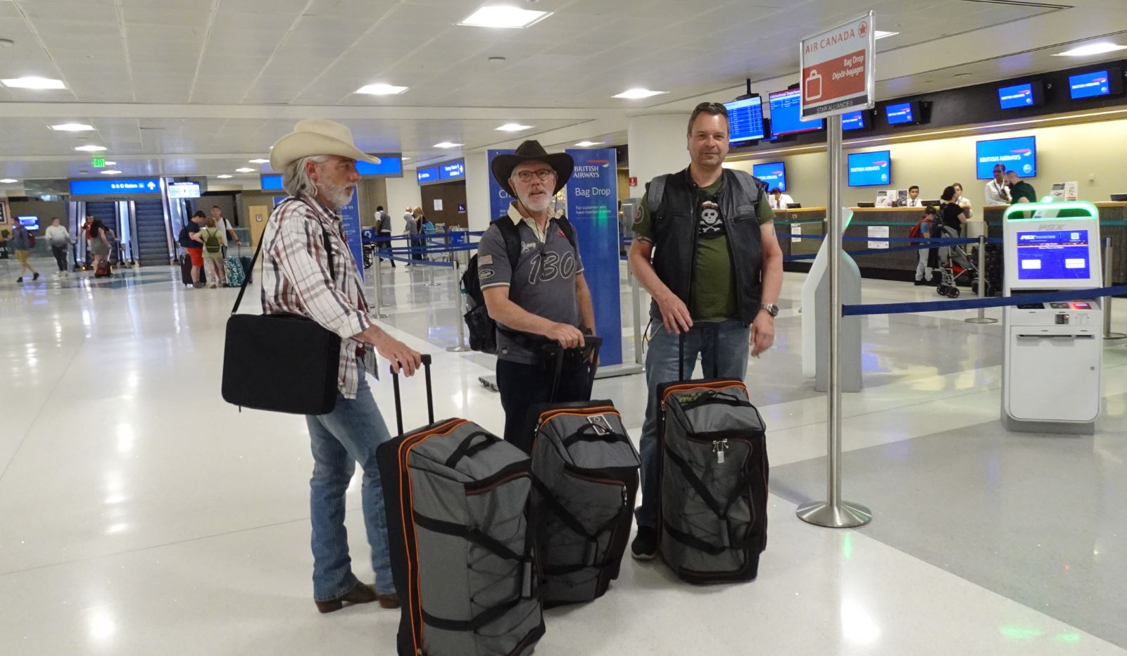 Départ pour l’aéroport de Genève, Dom fait le TAXI pour ses deux potes. Il passe à Vuflens-le-Château vers 9h00 et prend Phil chez lui et ensuite chez Dick pour une photo souvenir et des embrassades touchantes avec sa famille. Sur la route pour l’aéroport, rien à signaler si ce n’est que Phil aperçoit déjà des bisons dans un champ alors qu’il ne s’agissait que de vulgaires canassons. Avait-il déjà la tête dans le Far West ?