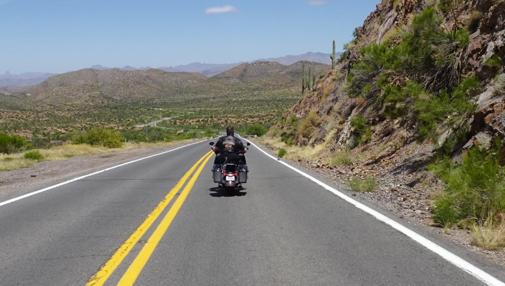 Réveil et déjeuner à l’hôtel et départ pour Phoenix. Une étape assez longue sur une route variée entre longs bouts droits et petits cols dans ce paysage désertique jonchés de milliers de cactus. Nous prenons un déjeuner au « Best of Bourbon Sports Bar and Grill » à Mesa, faubourg de Phoenix, avant de repartir sur notre destination. Faisons quelques arrêts pour des séances « real movies » avec des montages assurés par notre Steven Spieldick.