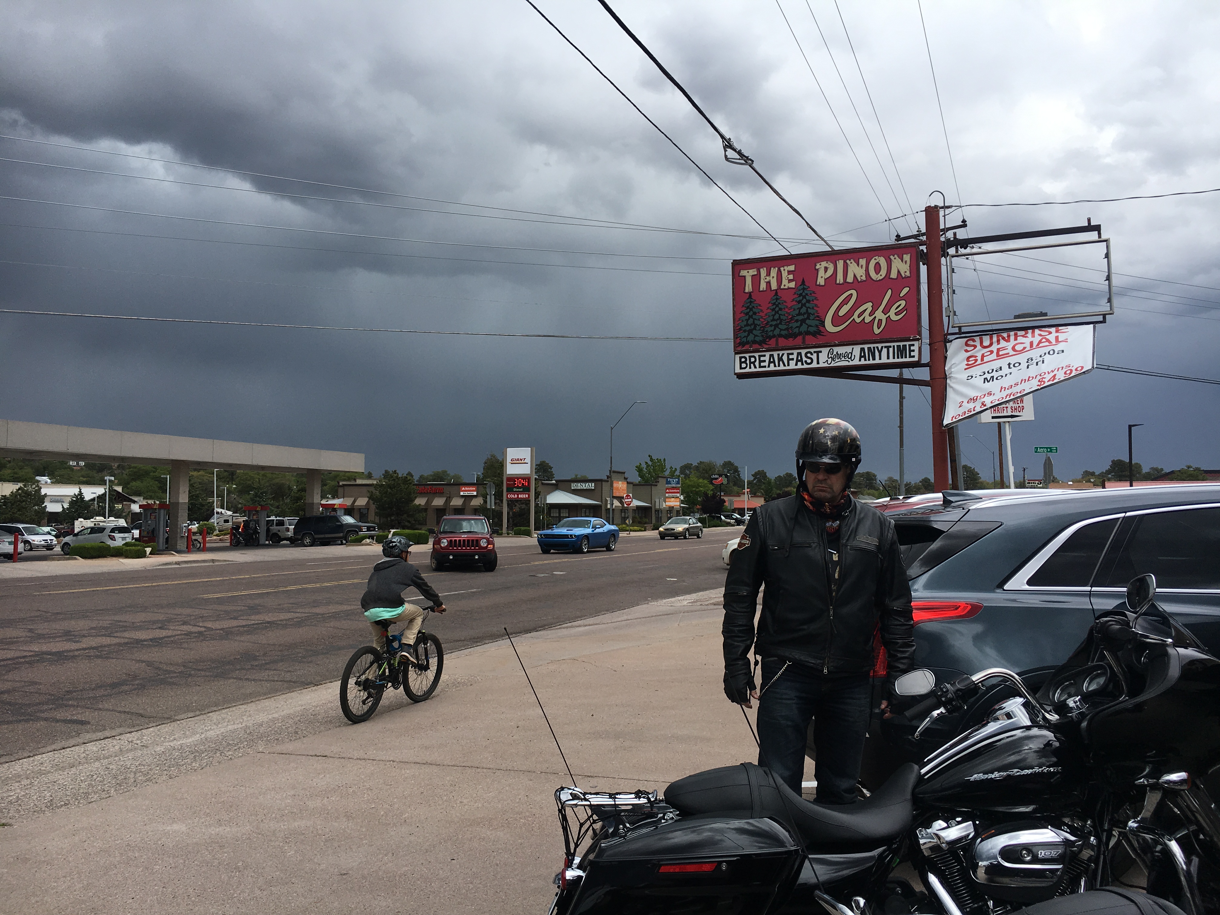 Nous sortons de Phoenix (Scottsdale) avec facilité et nous nous retrouvons assez vite sur la route direction le Nord en tenue légère car le temps était parfait. Toutefois, le bonheur a été de courte durée car à l’approche de Payson, de gros nuages noirs se profilent au loin et quelques gouttes commencent à tomber. Sous la menace de grosse pluie, nous décidons de faire le point et prenons un lunch US à Paysan au "Pinon Café" ou Phil, soucieux de la ligne de son pote Dom commande des hamburgers typiques mais avec une seule frite. La serveuse du coin nous prend au mot et s’amène avec une frite dans un grand plat !! Bref, après quelques plaisanteries, nous recevons quand même une vraie ration que nous avalons rapidement.