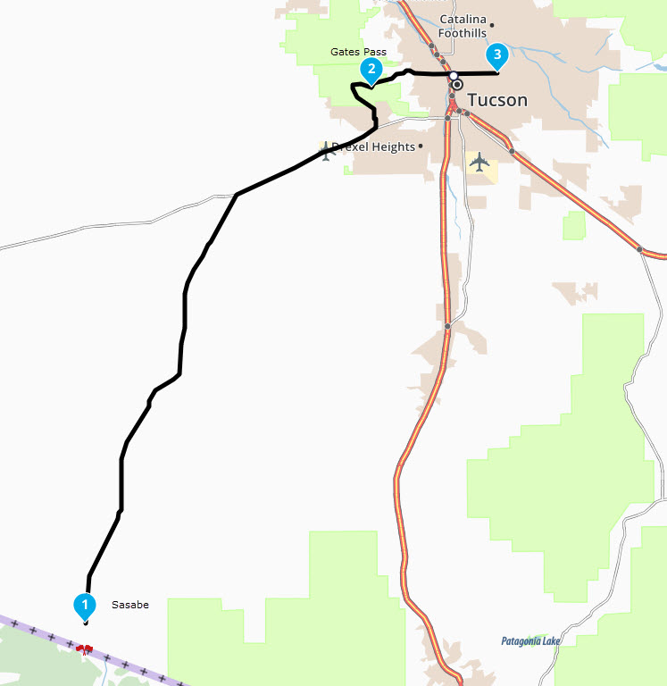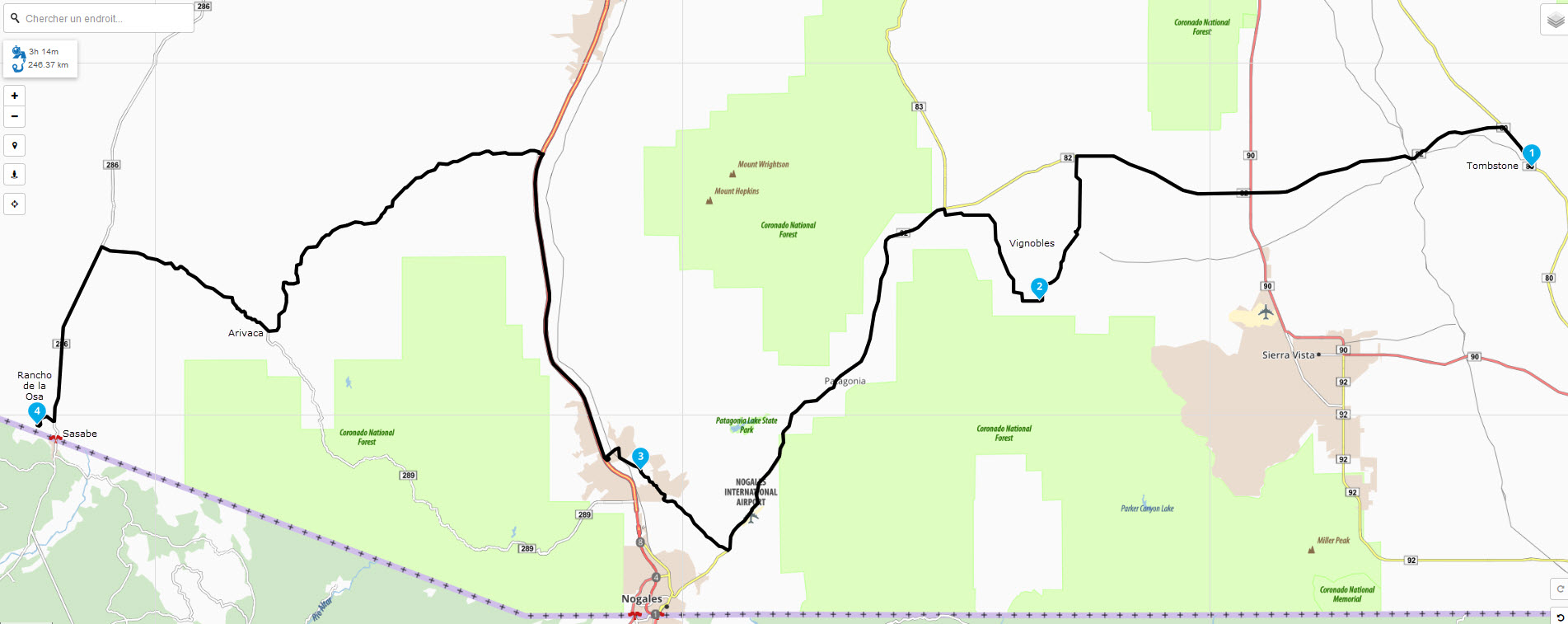 Ce moment de détente passé, nous repartons sur cette belle route sinueuse pour notre objectif du jour, un magnifique Ranch perdu à 200m de la frontière Mexicaine. Le dernier KM se fait sur une route poussiéreuse et nous atteignons finalement vers 15h00 environ le Rancho de la Osa à quelques KM de Sasabe, AZ.